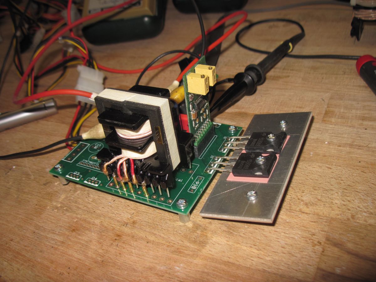 Die letzte Aufnahme zeigt den Test mit 4,77V= Betriebsspannung, 2,958A= Stromaufnahme, 6,44Aeff Primärstrom und einer Resonanzspannung von 374Vpp