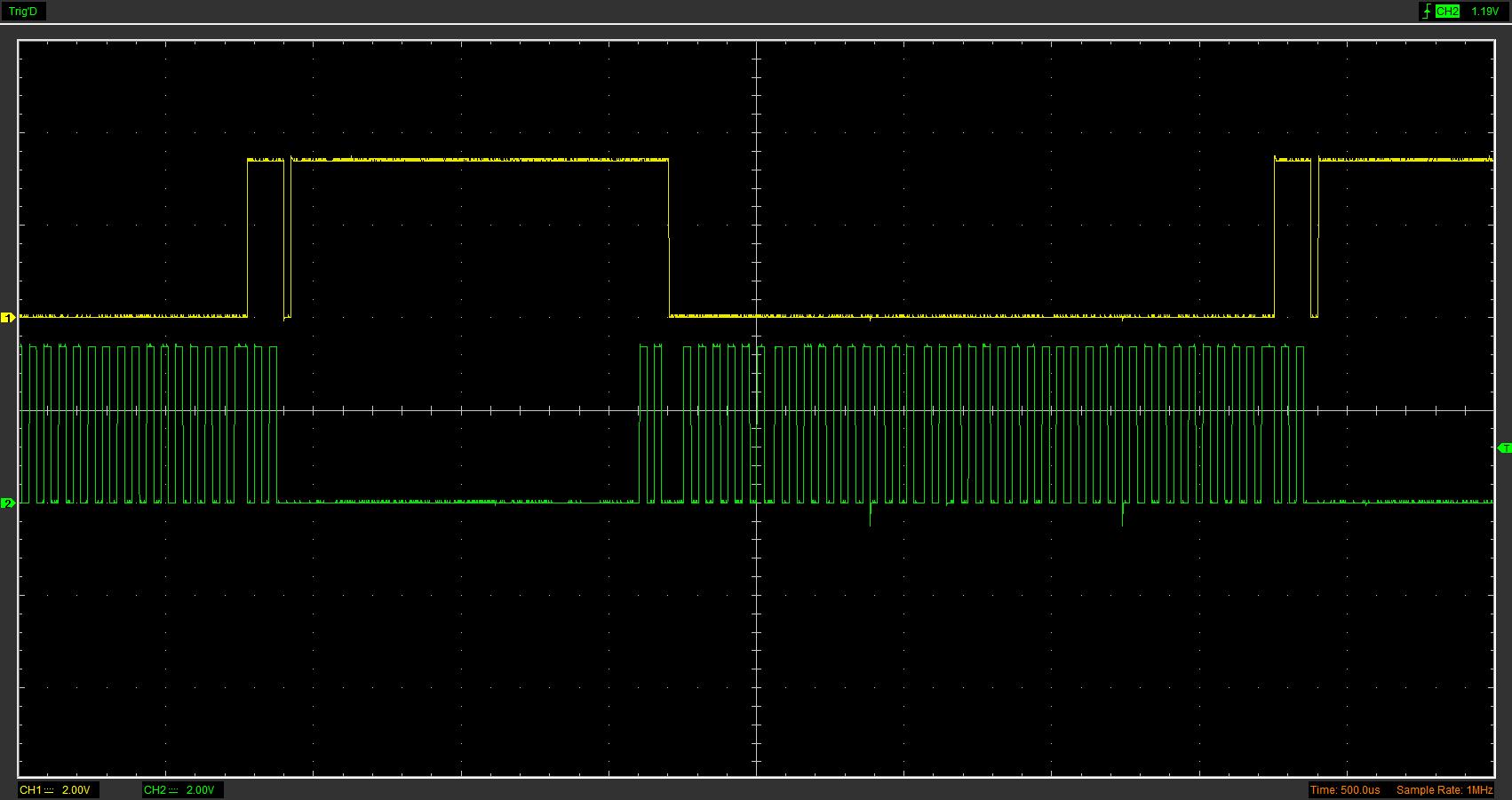 Dadurch dass der Pegel so komisch war, habe ich Mosi und Miso einmal aufgenommen und ich war erschrocken auf beiden war das gleiche Signal mit nur einem unterschied, dass die Pegel des 1V8 Miso viel zu niedrig sind. Da dachte ich mir das kann doch nicht sein der Slave sendet in dem Fall der CSR8645. Wenn der schon ein unbrauchbares Signal sendet kann der TXB0108 doch kein brauchbares daraus machen.