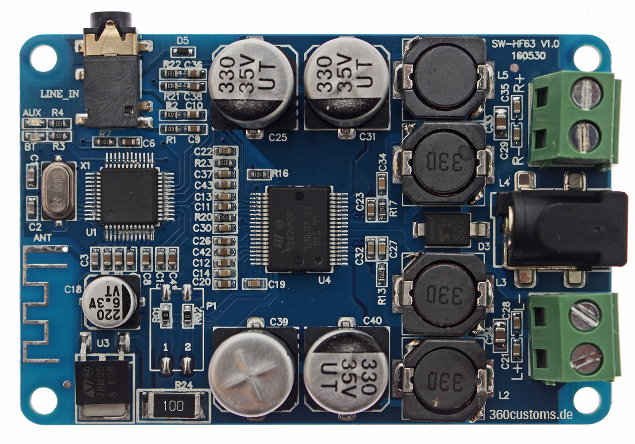 Die unteren 4 Pins auf der Rückseite der Platine sind, nicht wie zuerst vermutet UART TTL, USB. Das Teil kann wohl auch USB-Host für USB-Sticks, nicht getestet, aber es lässt sich einfach an den Rechner anstecken und meldet sich als 16bit/48kHz Audiodevice. (Spielt auch)