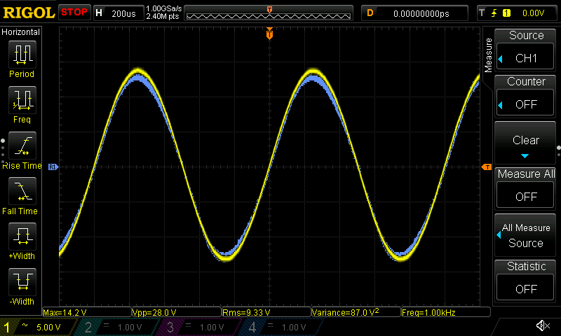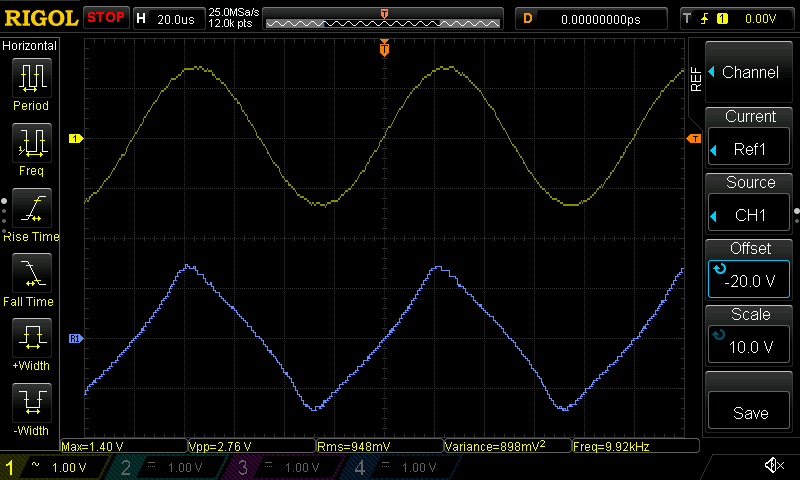 Der Grad der "Verbiegung" ist natürlich auch amplitudenabhängig, hier gemessen kurz vor Clipping. Kommt das vom Class-D Konzept oder von den Spulen?
