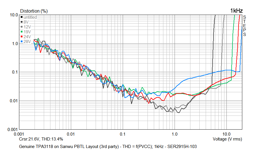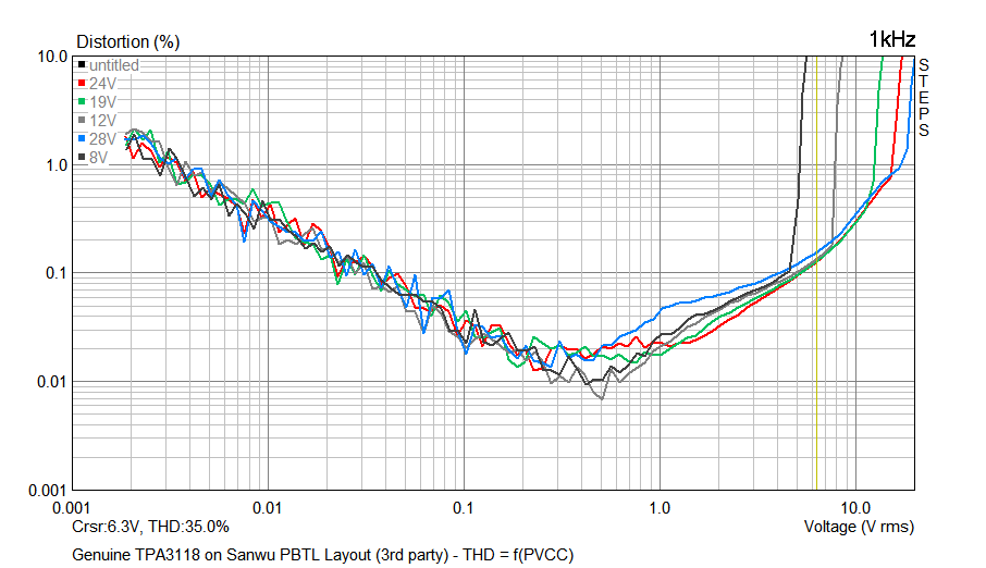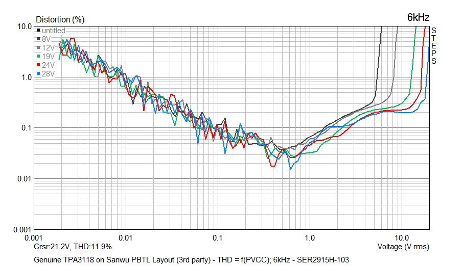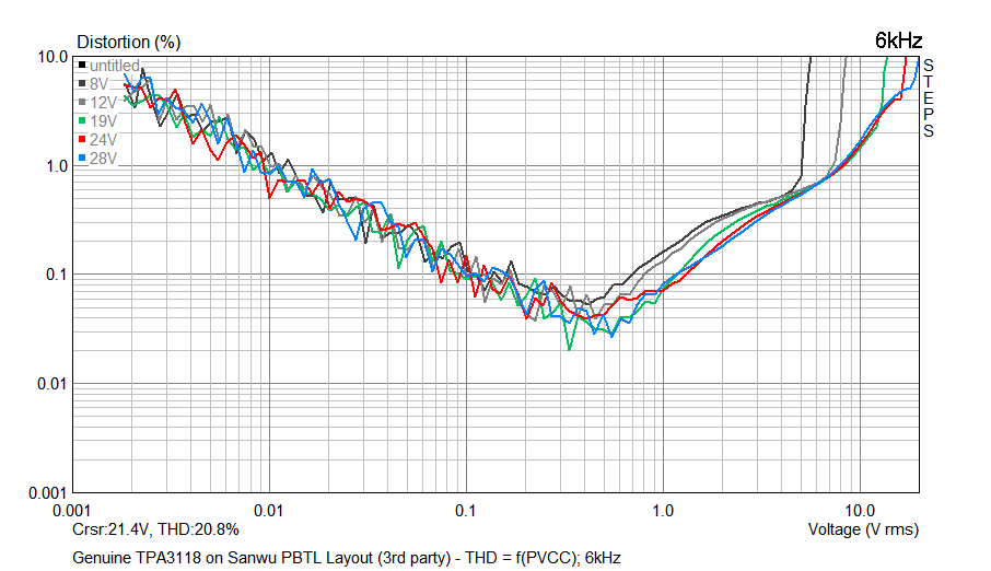 Die "Stock" Spulen zeigen m.E. erste Anzeigen von Sättigung bei ca. 4.5Vrms an 4R Last, wie die folgenden Plots zeigen. Hierbei gezeigt die THD für verschiedene Betriebspannungen und Leistungen bei 1kHz und 6kHz.
