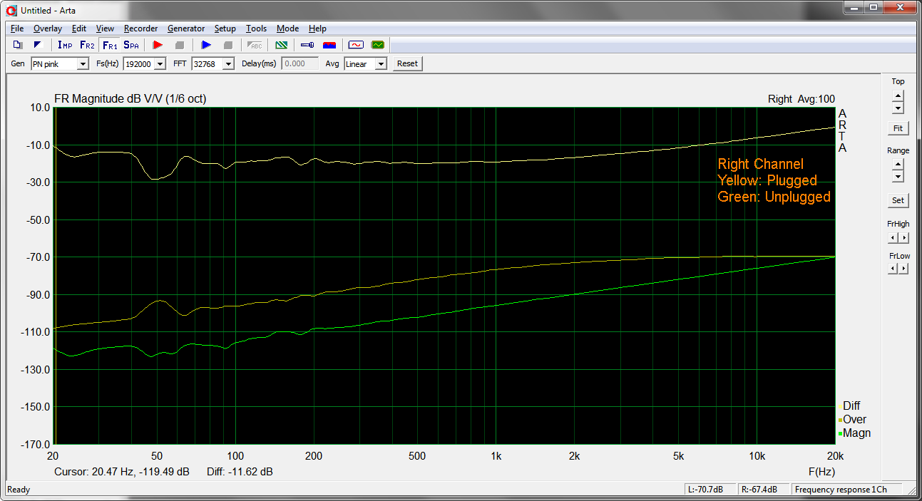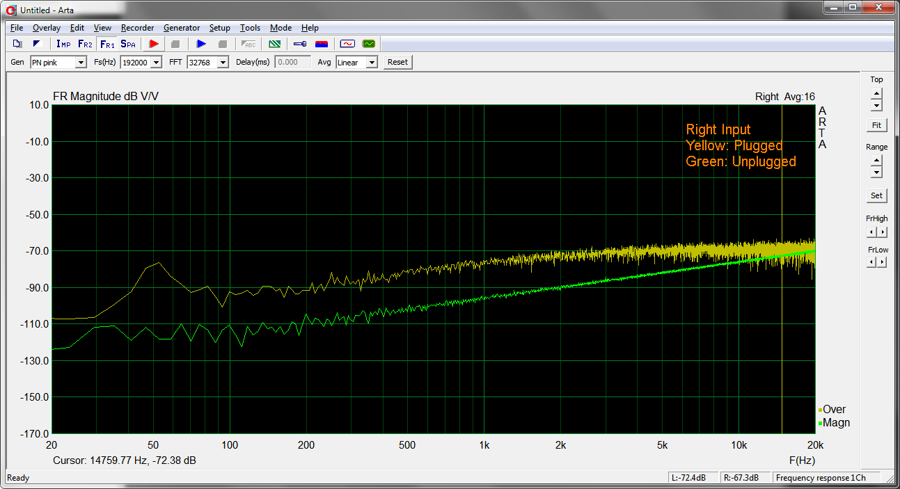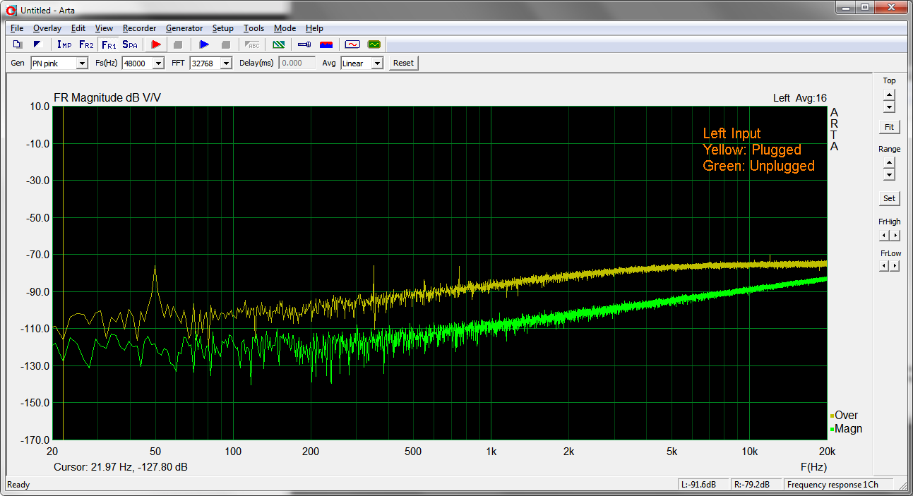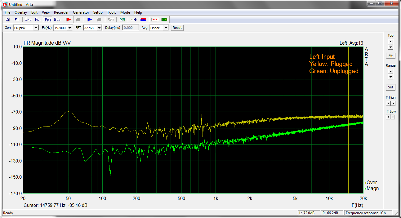 Vergleich Noise-Floor Eingang Links/Rechts mit/ohne gestecktem 6.3mm Klinke/Cinch Adapter.