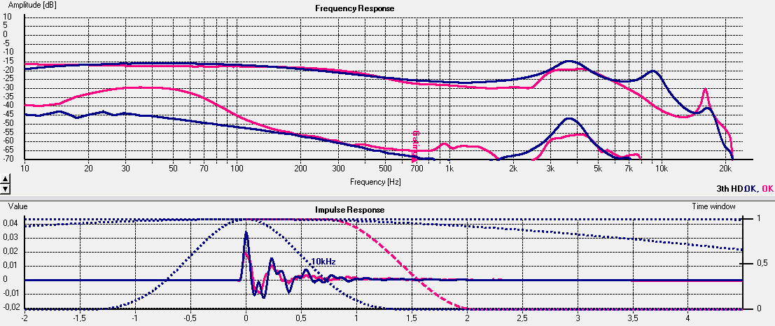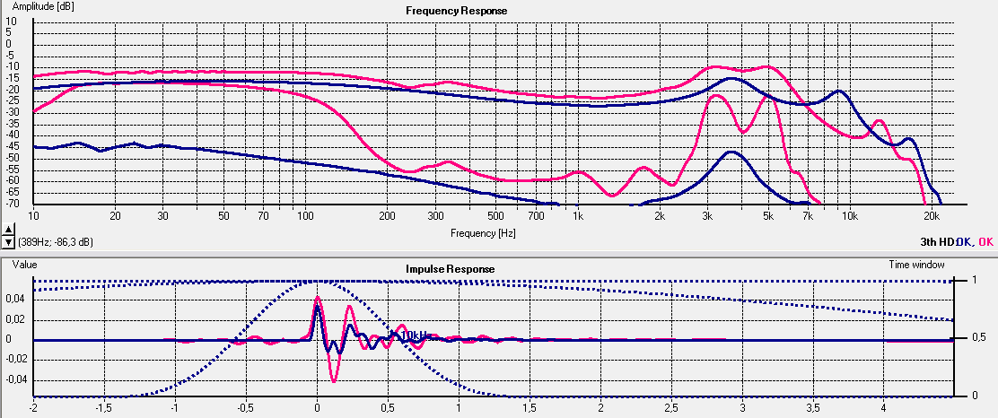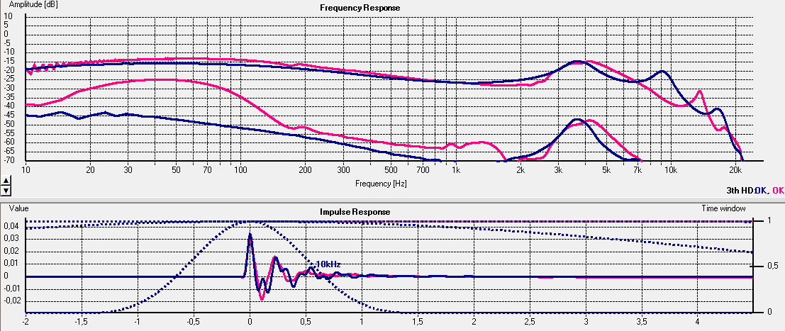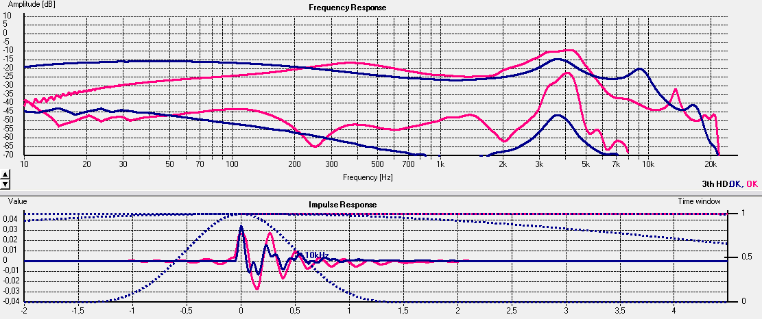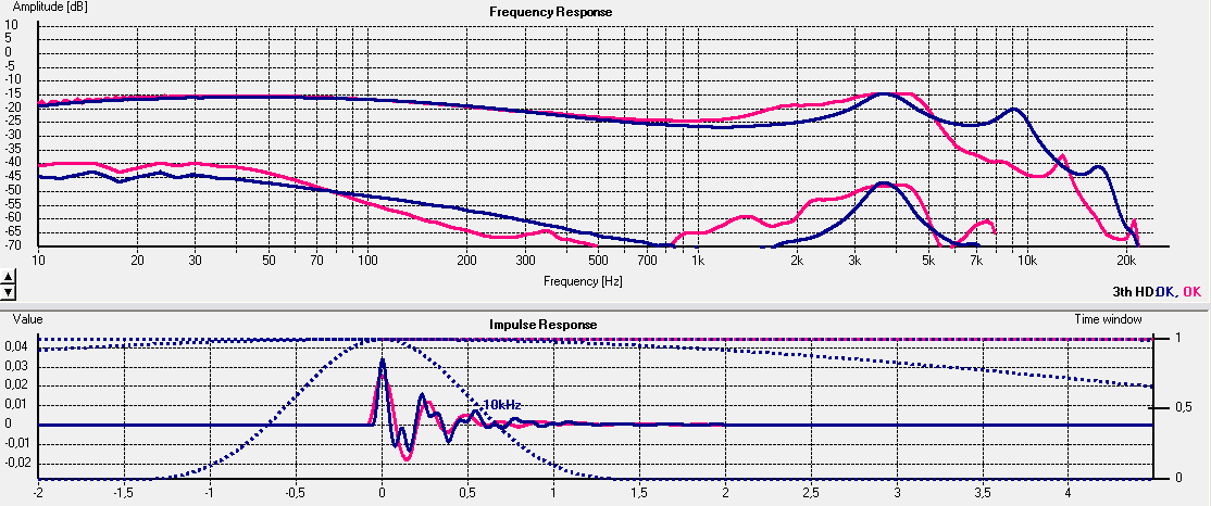 Signal und window habe ich i.vgl. zu damals geändert, um möglichst genau zu messen; log sin sweep, kann auch Klirr, daher K3 (rot+blau) dazu angezeigt