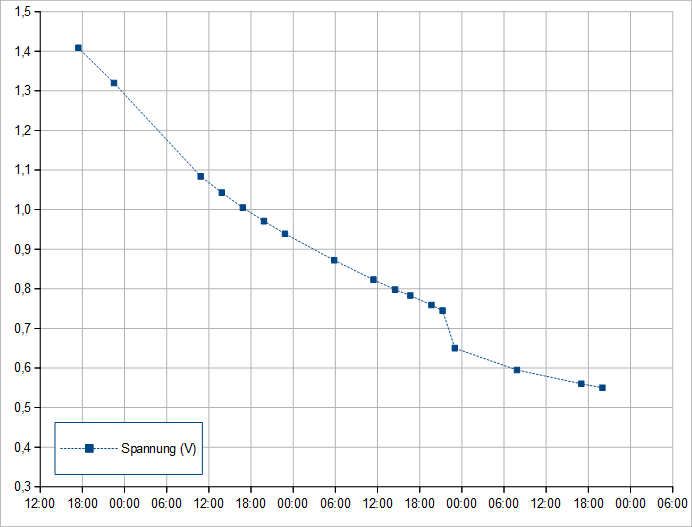 )Der GoldCap hält die Uhr etwas über 2 Tage am Leben. Wenn die Uhr stehenbleibt, gibt es den interessanten Sprung in der Messkurve. Über den Grund dafür bin ich mir noch unsicher.