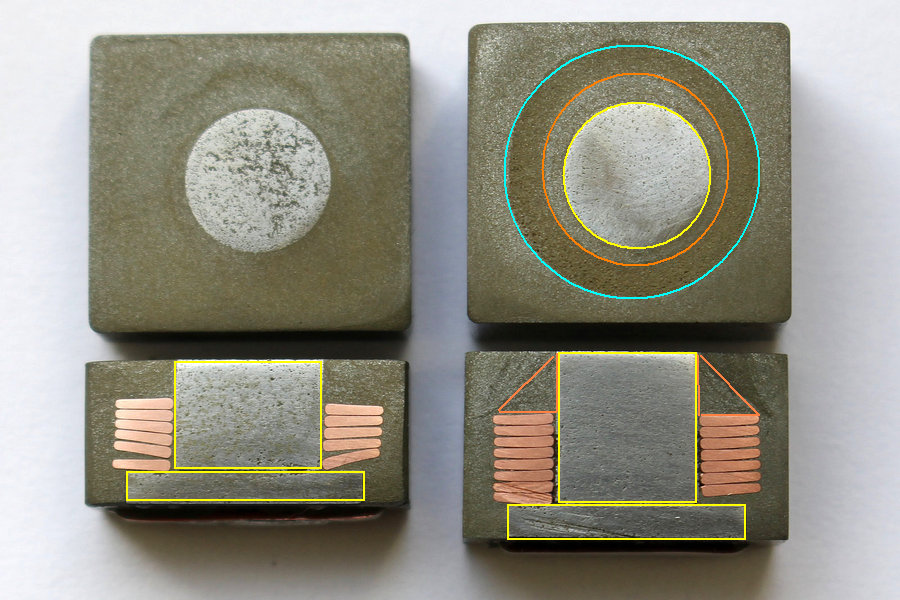 Die Flachdrähte werden unten herum um die Eisenpulverplatte gebogen. Somit existiert ein unterer Sockel auf den der mittlere Eisenpulverkern aufgesetzt wird - mit Luftspalt versehen. Danach wird m.E. der Wickel aufgesetzt und unten gebogen. Bei der -472 sieht es so aus, als ob der Wickel dann mit einer Masse am Kern fixiert wird. Nachfolgend wird die Ummantelung aufgespresst und der obere Spalt mit einem weiteren Material verschlossen.