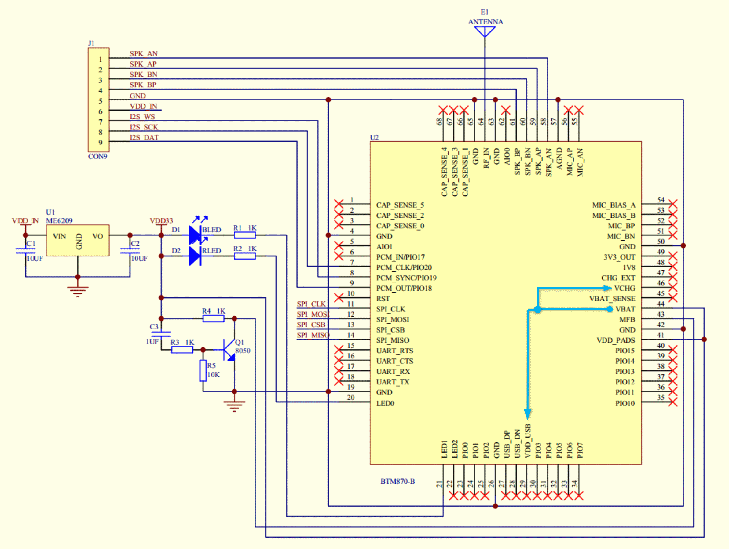 Damit USB funktioniert, musste ich an VDD_USB und VBUS (auch VCHG genannt) 3.3V anlegen. Sobald ich aber 3.3V an VBUS anlege, gehen die LEDs aus und der Chip ist per Bluetooth nicht mehr auffindbar. Er wird stattdessen aber per USB erkannt z.B. als Soundkarte (Output geht aber auch nicht). Auch per Programmer kann ich in diesem Zustand noch kommunizieren. Es scheint als würde er die VM deaktivieren, sie ist aber per Programmer aktiviert und das Modul tut trotzdem keine Regung.