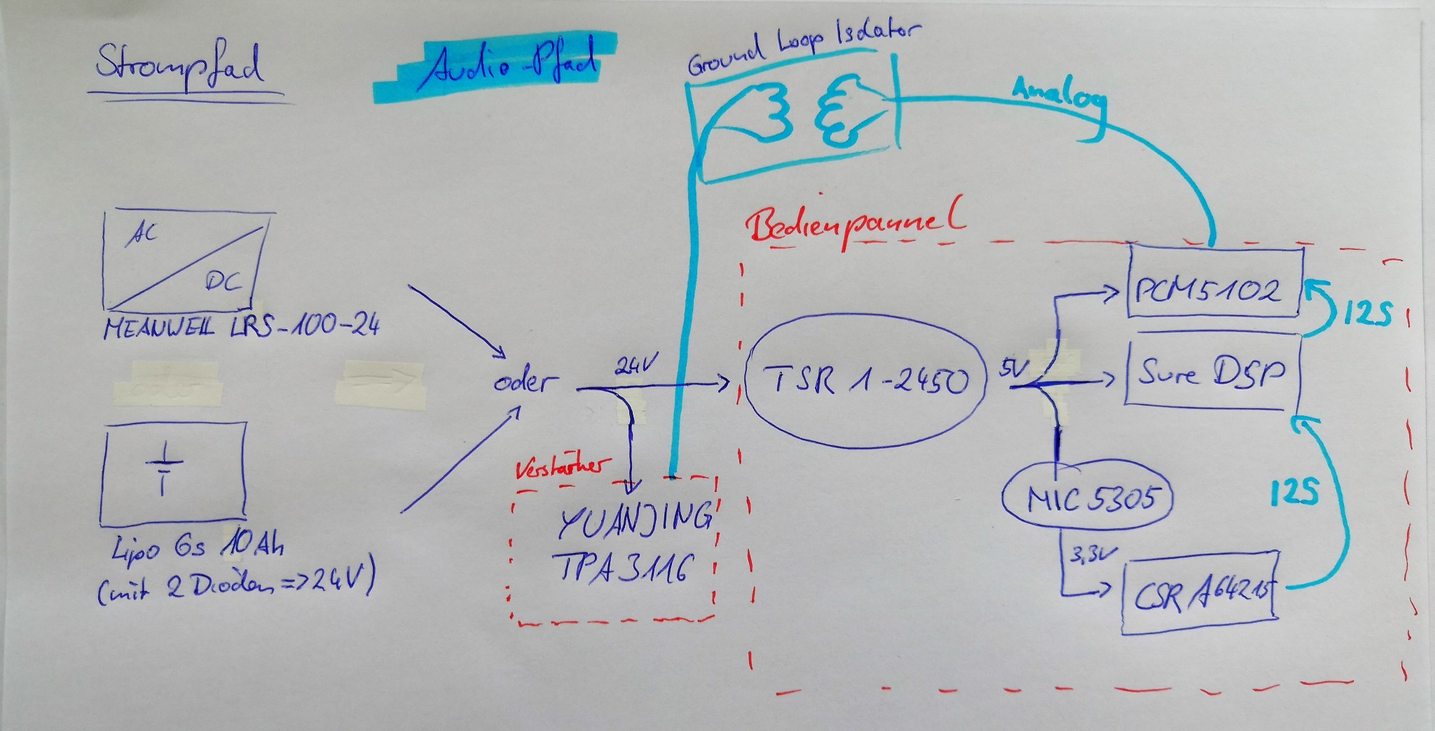 Ich habe schnell eine Skizze zum Strom und Audio-Pfad erstellt: