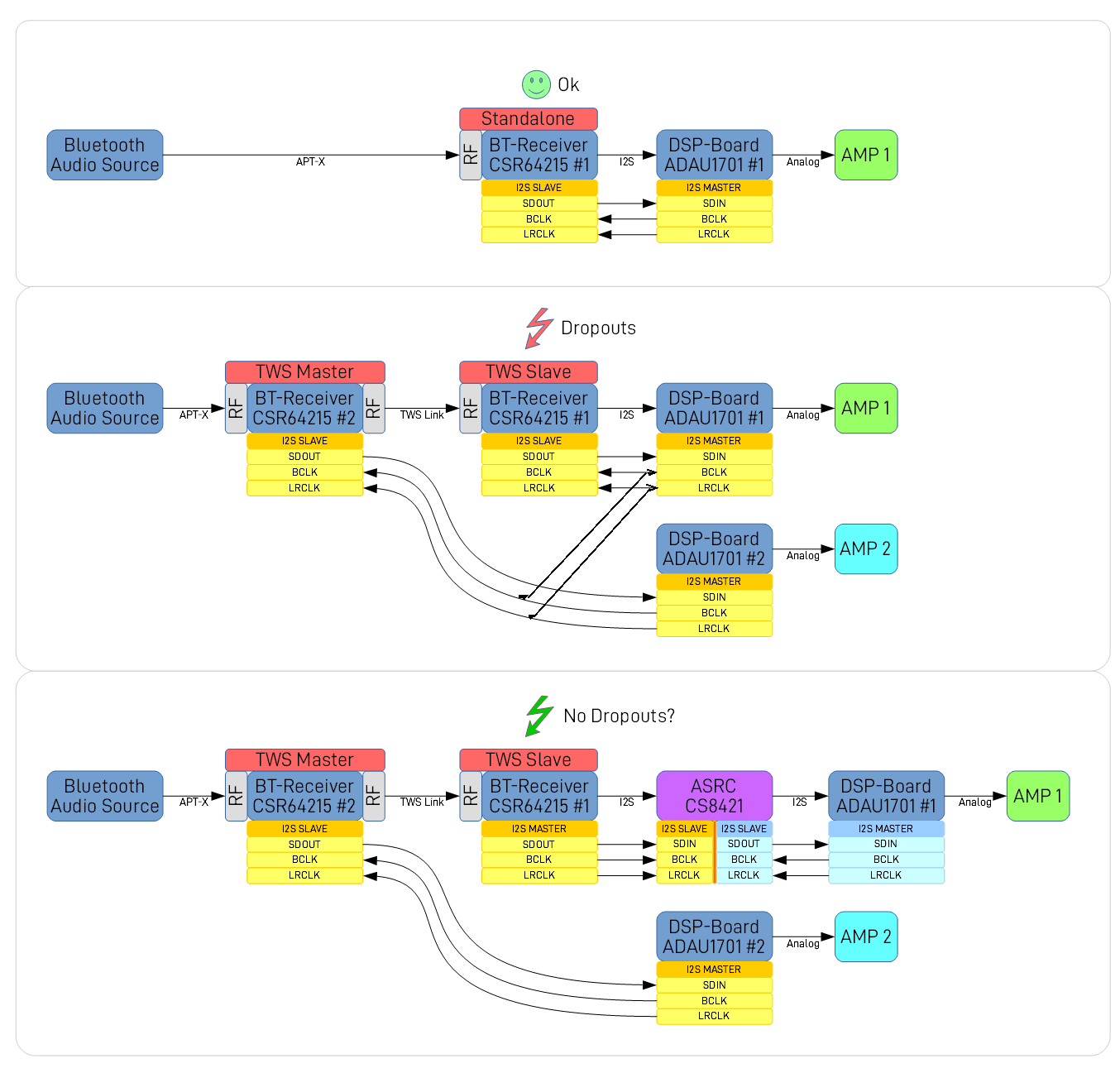 aha....wie vermutet: logischer Fehler; du hast zwei asynchrone ckls .... der eine ADAU , der master clock, muss natürlich auch den clock(bcl, lrckl) für den anderen ADAU liefern. Dann sollte es astrein laufen.