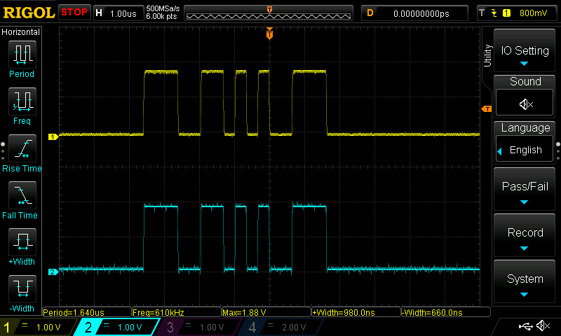 Kanal 1 ist am Ausgang des CSRA Boards, Kanal 2 ist direkt an PIN11 des ADAU, MP0.