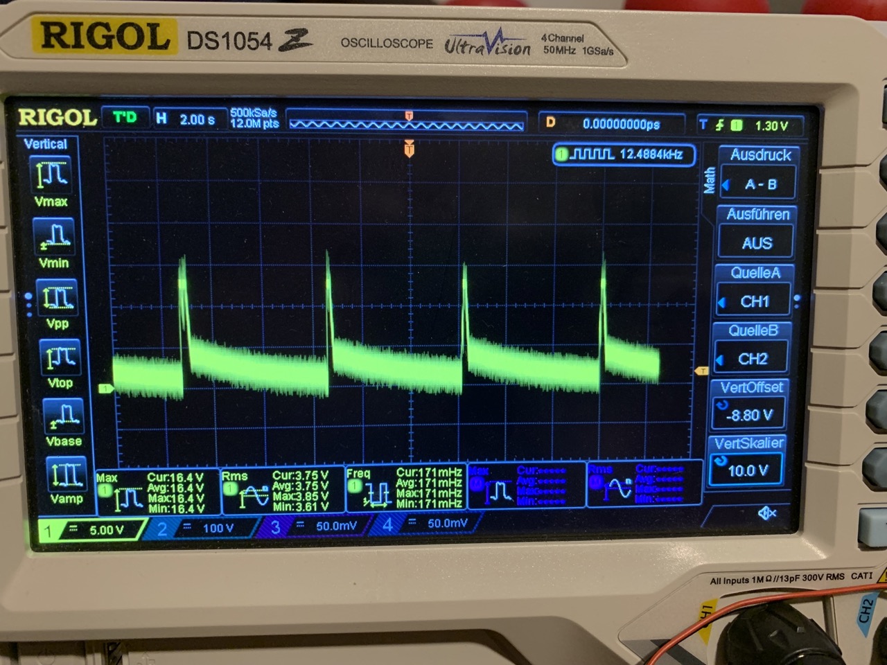 So'n richtig geiles Bild habe ich bei der Differentialmessung Kanal 1 - Kanal 2 nicht hinbekommen. Nach den Feiertagen habe ich Zugriff auf ein Scope mit isolierten Eingängen, dann messe ich das mal gegen.