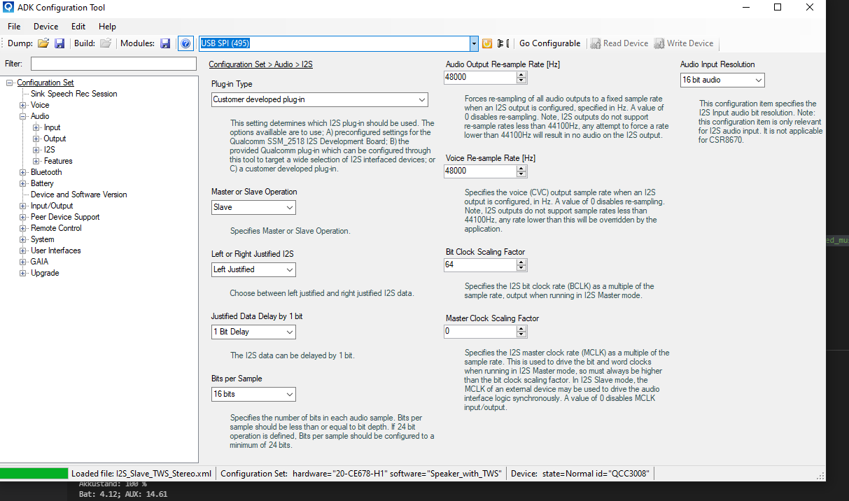 Verwendet wird ein QCC3008 Breakout-Board, welches Audio per Bluetooth empfängt und per I2S an einen ADAU1701 weiterleitet. Die passende Konfiguration etc. habe ich bereits in der ADK vorgenommen und ein Audio-Stream, mehrere angeschlossene Geräte etc. sind möglich. Jedoch ist das Ausgangssignal (QCC3008 --> ADAU1701 --> PCM5102) stark verrauscht und hört sich so an, als ob die Clocks nicht recht zueinander passen oder untereinander verzögert sind.