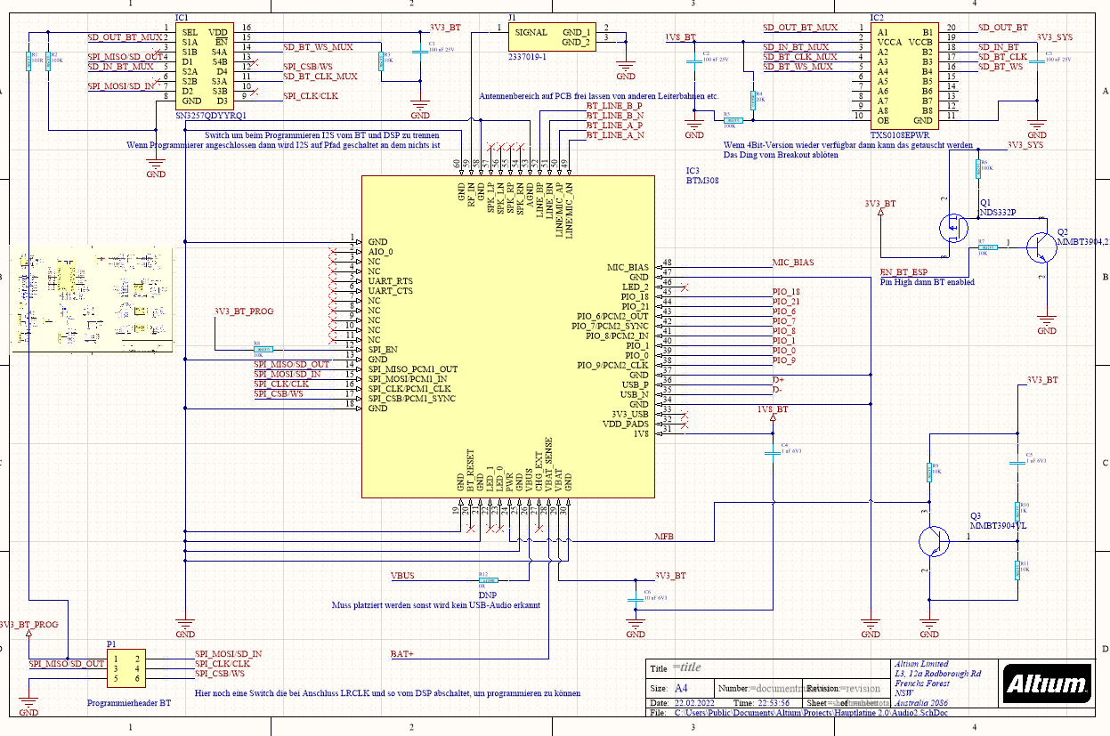 Hätte jemand spontan eine Idee, was das Problem sein könnte? Noch ein paar mehr Infos: zwischen BT-Modul und ADAU befindet sich ein Level-Shifter