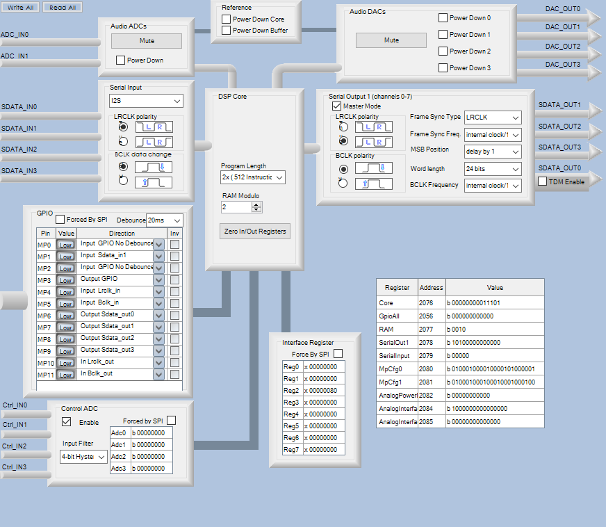 Unter Sigma-Studio habe ich auch alle möglichen Konfigurationen ausprobiert, jedoch ohne Erfolg. Entweder gibts gar kein Signal oder verschiedene Variationen von stark verrauscht. Ich weiß leider nicht wie man hier Bilder anfügt, sonst hätte ich Bilder der Konfigurationen und Schalpläne psoten können. Kann ich aber nachliefern, sobald ich weiß wie das geht.