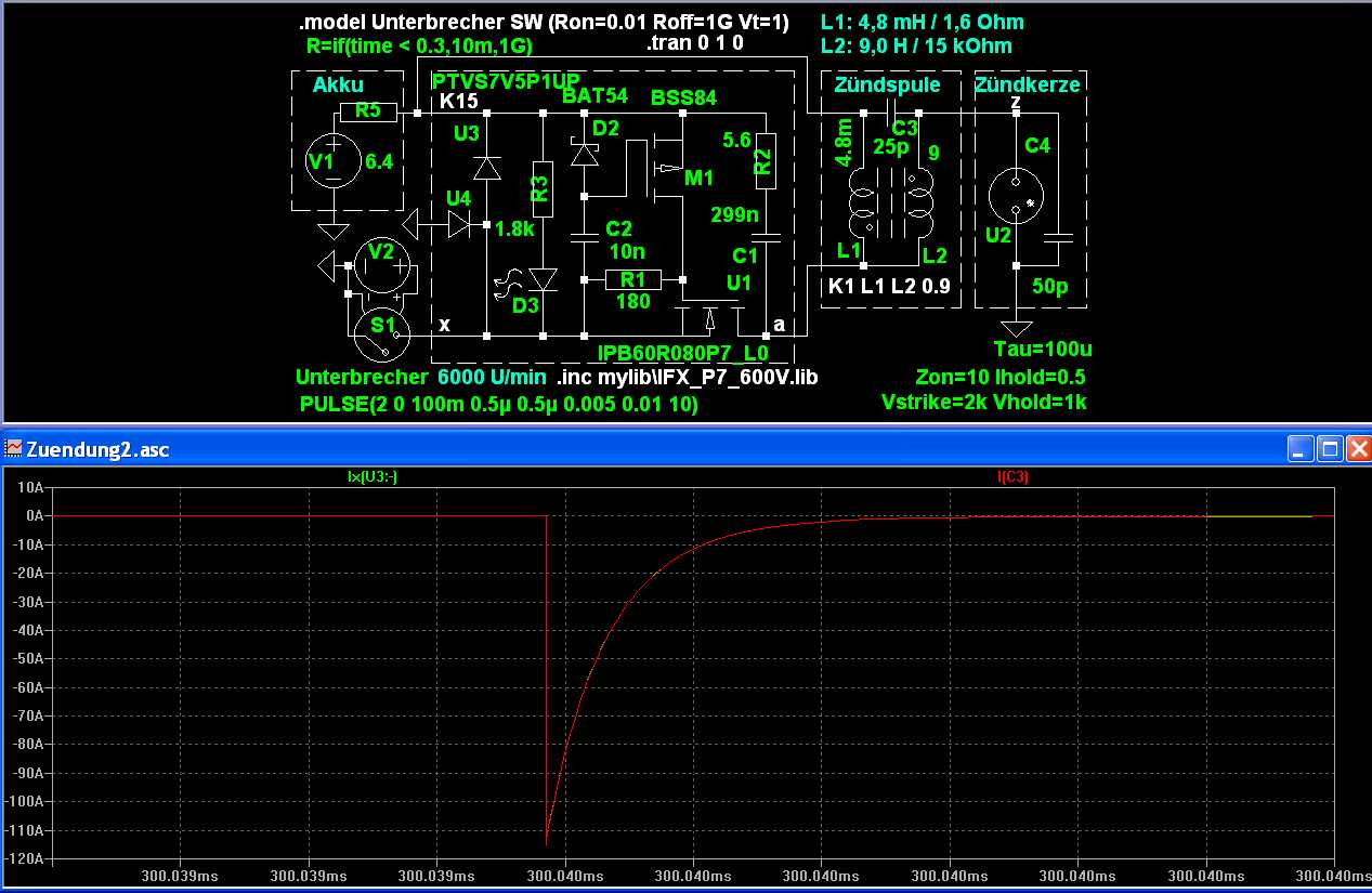 Begrenzt wird der Stromfluss durch den ESR von C3, den ich mit 100 Ohm spekuliert hab. Der Zündkerzenwiderstand ist vernachlässigbar. Lichtbogen sind äußerst niederohmig.