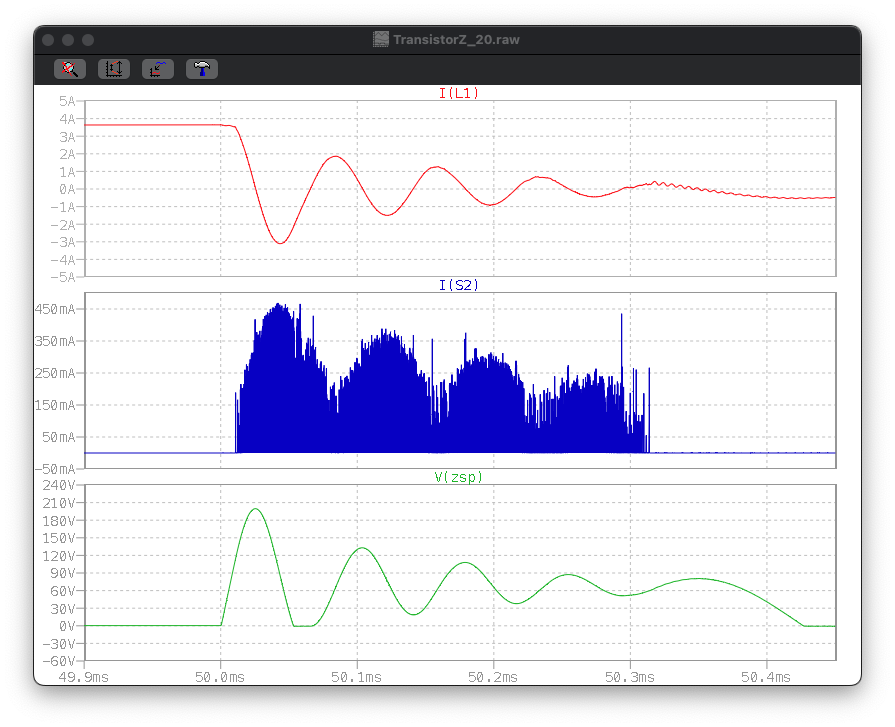 Man sieht hier deutlich die Schwingungen und Umladungen. Wenn der Stromfluss durch den Schwingkreis negativ wird, hat es sogar ein Anstieg des Sekundärstroms zur Folge. Wegen der Dämpfung ist das nur bei der ersten Schwingung relevant. Im Gegenzug verlischt der Funken fast (oder ganz, je nach Simu), wenn der Stromfluss die Richtung wechselt.