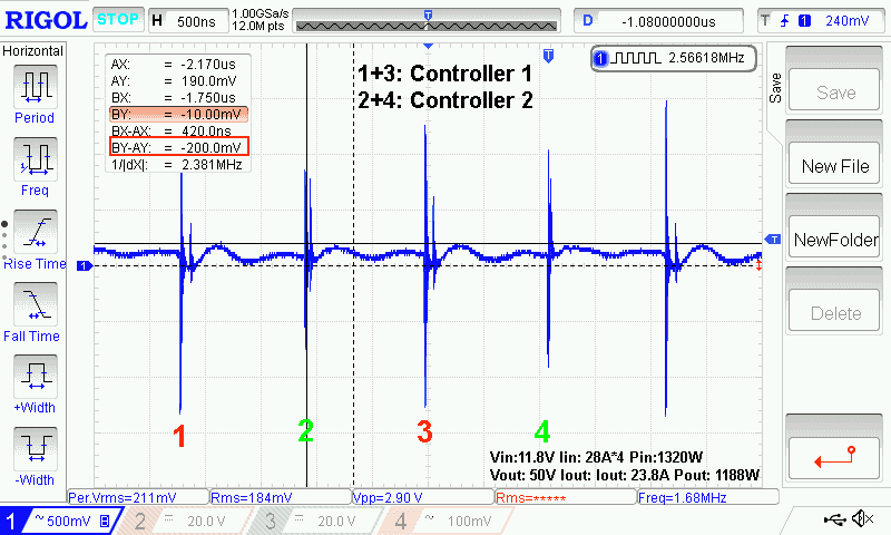 Was mich noch stört, sind die auf dem Scope zu sehenden Peaks. Diesmal habe ich einen Pigtail direkt am Ausgangselko einer Phase angelötet. 1:1 Ist das eher mein messtechnisches Problem?