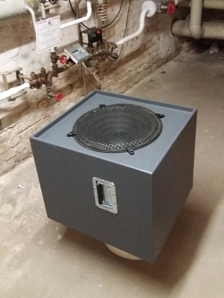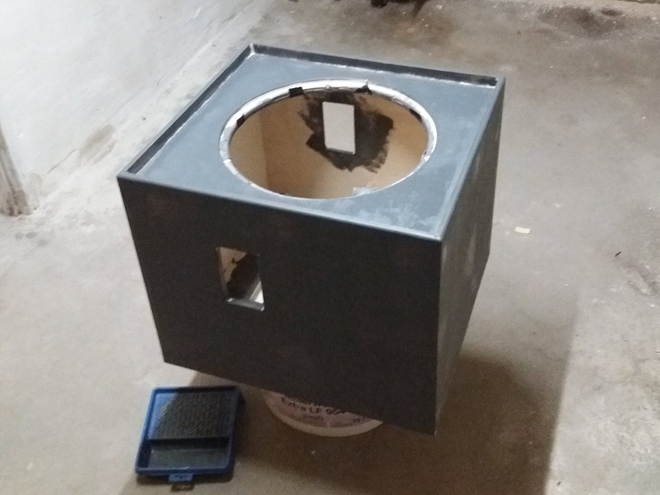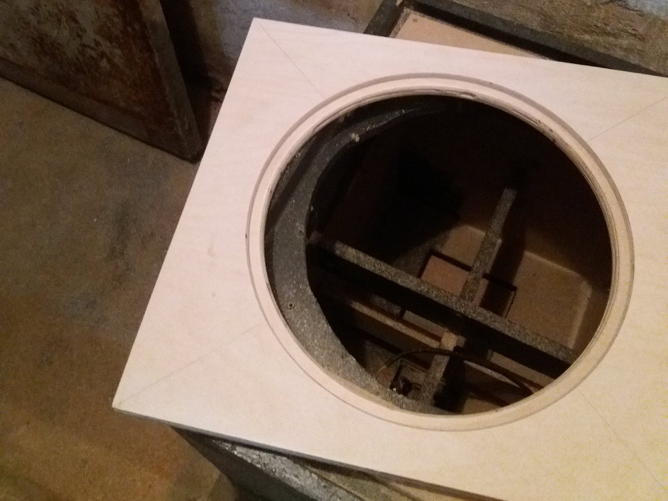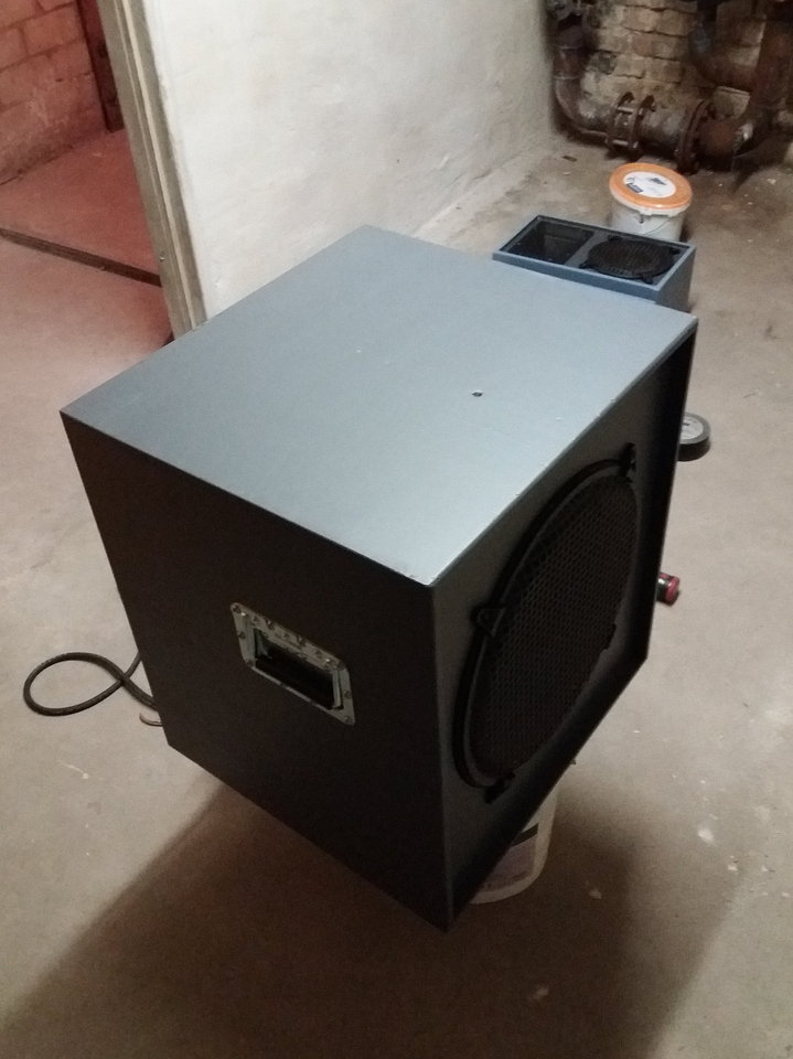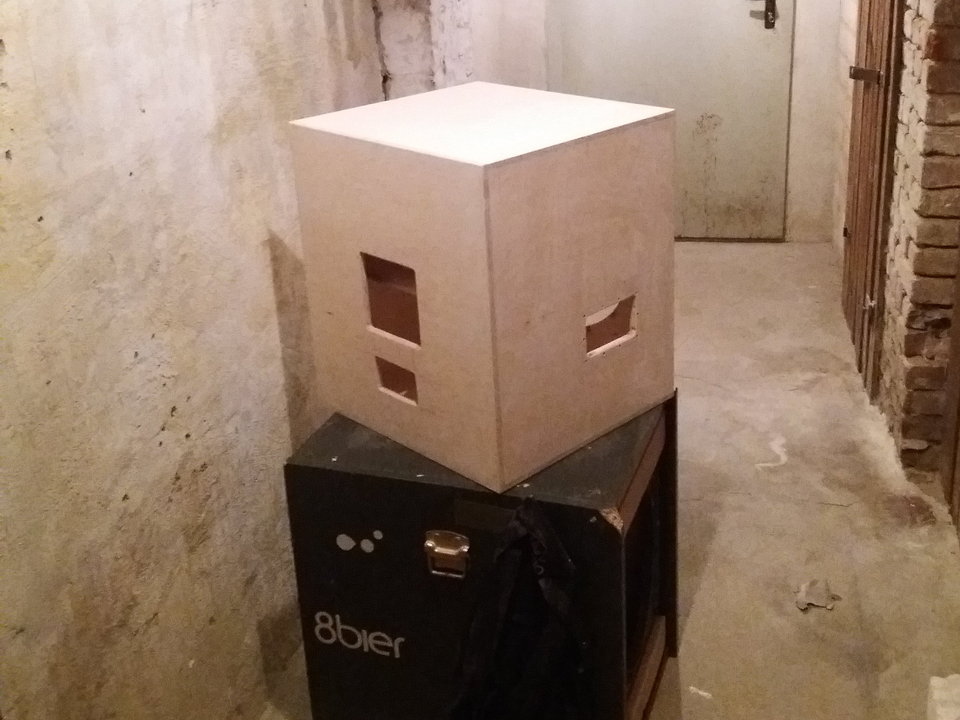 Volumen ca. 95 Liter, etwas höheres Tuning (75Hz) gibt Peak bei knapp 90Hz. Geometrie klassisch BR mit rückseitigem "Port" auf Achse 15x15cm. Dank nun vorhandener Oberfräse ist die Konstruktion nun strömungsoptimiert (Streben + Port + Ring abgerundet). Gehäusegröße 55x50x45cm. Lack in Extramatt, Griffe mit selbstsichernden Schrauben in V2A, Chassisgebfestigung mittels Eindrehgewinden (M5).