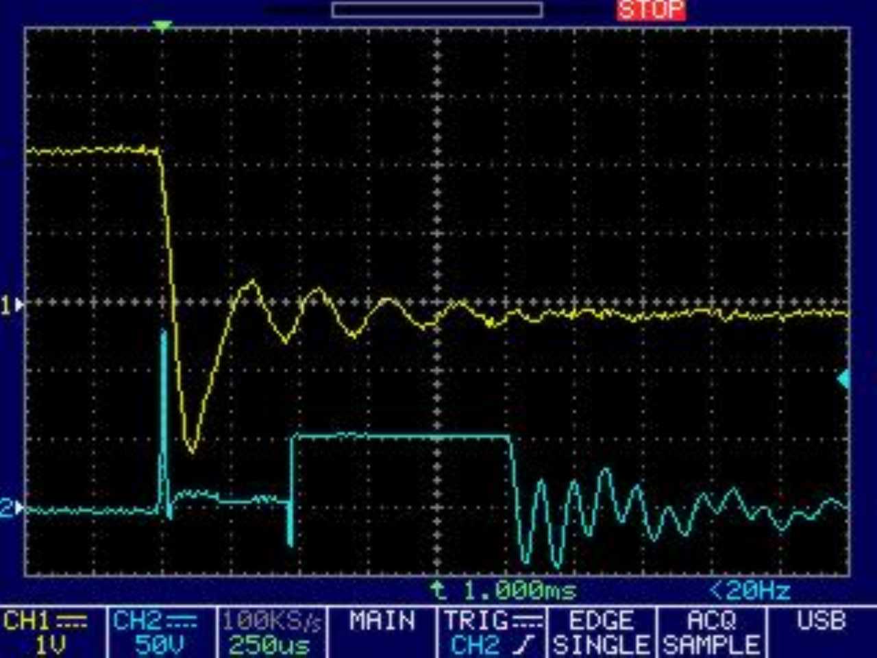 Aber die Messung der Sekundärspannung zeigt ein anderes Bild. Nur 500us Lichtbogen.