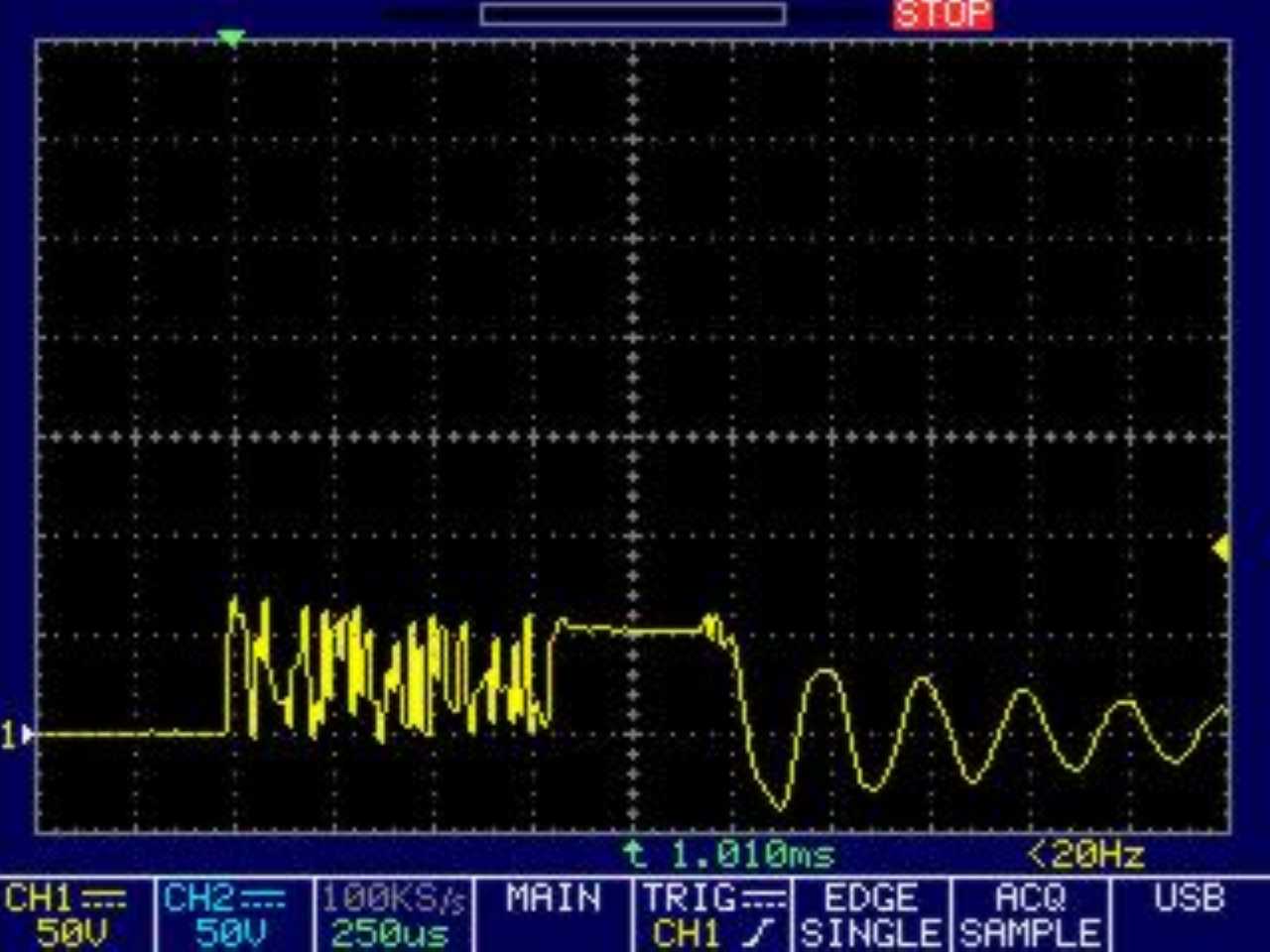 Ich hab die Ausgangsspannungsbegrenzung (VDR) nun auf 500V erhöht. Und auch eine Gasentladungsstrecke mit dreifacher Spannung. Und prompt sehe ich fast nur noch Bogenentladungs-Oszillationen. Primär sieht es sauber aus.