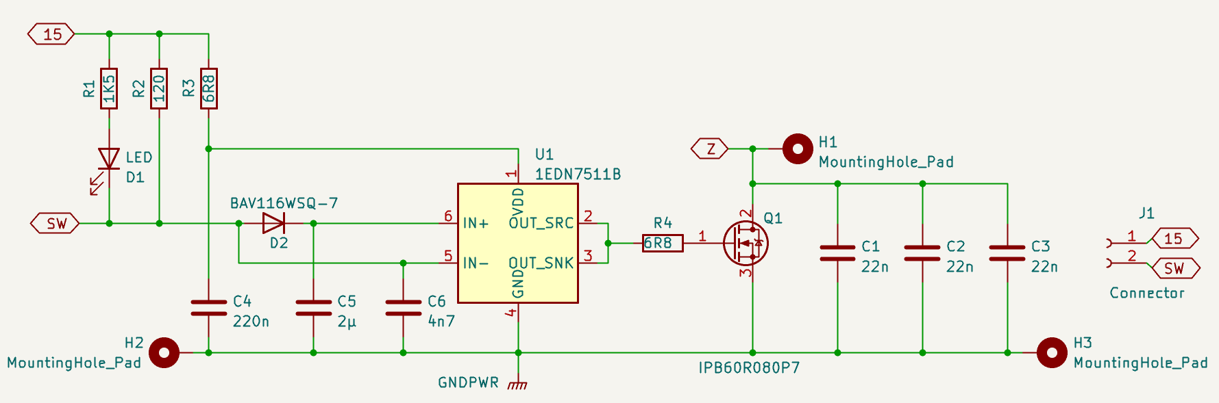 + der snubber 22n--68r oder sowas ist hier eher kontraproduktiv, sie verbrät nur Energie im R , statt einfach eine (passive) Ladung des caps zuzulassen.