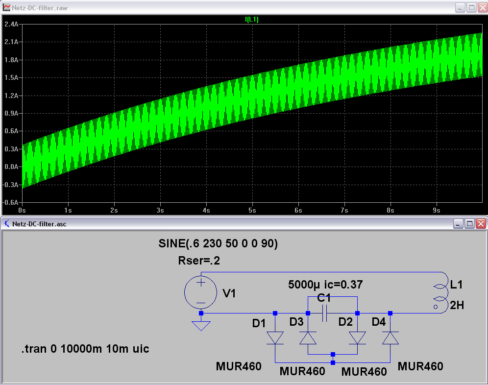 --> man sieht ganz klar: ohne Filter steigt der DC-Strom im Trafo gewaltig an, real würde er in Sättigung gehen, bzw "Geräusche" machen;