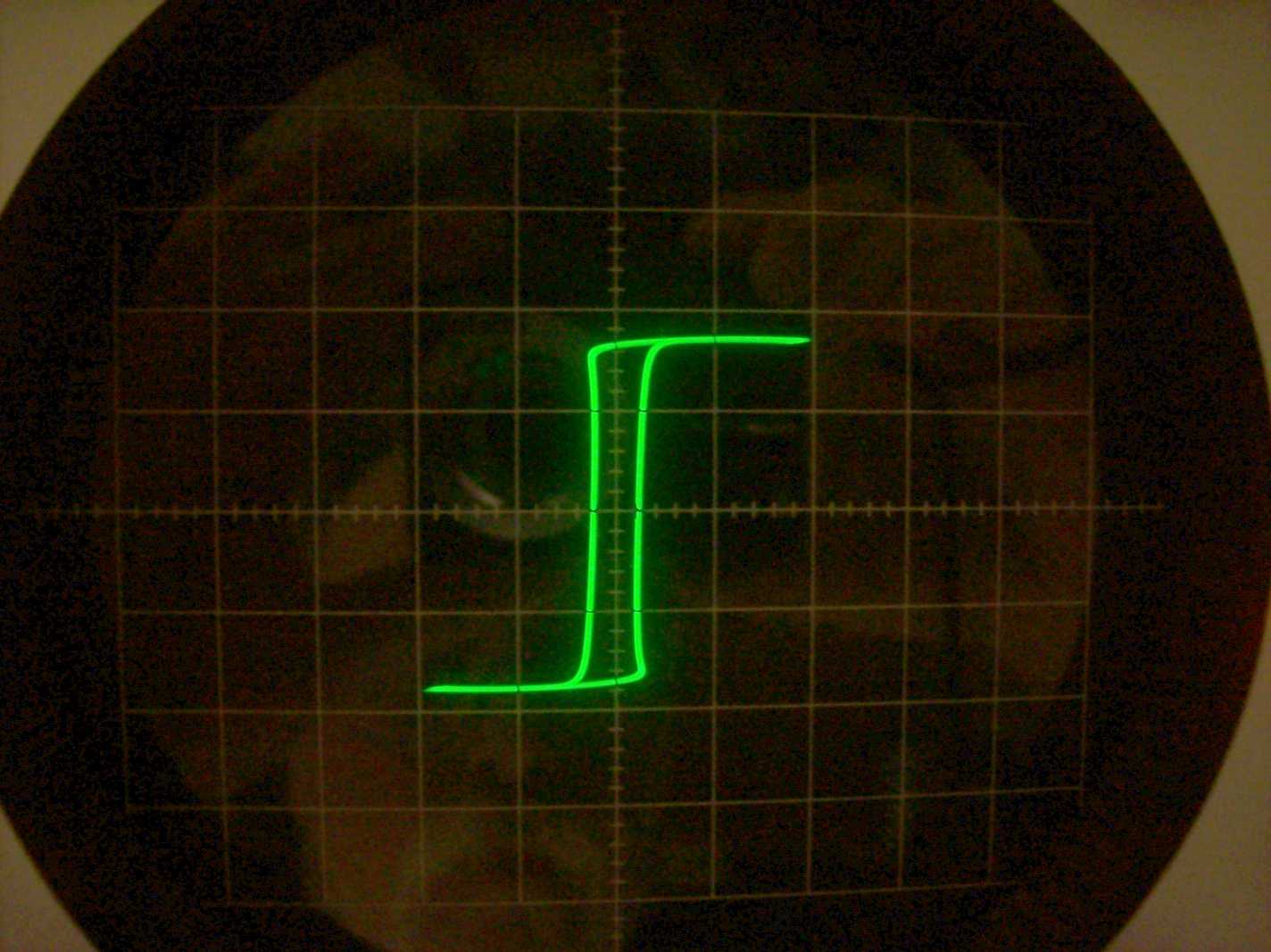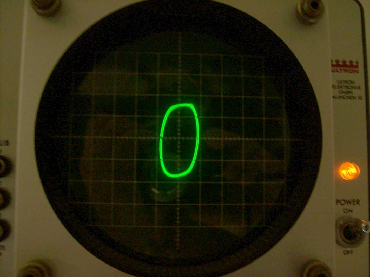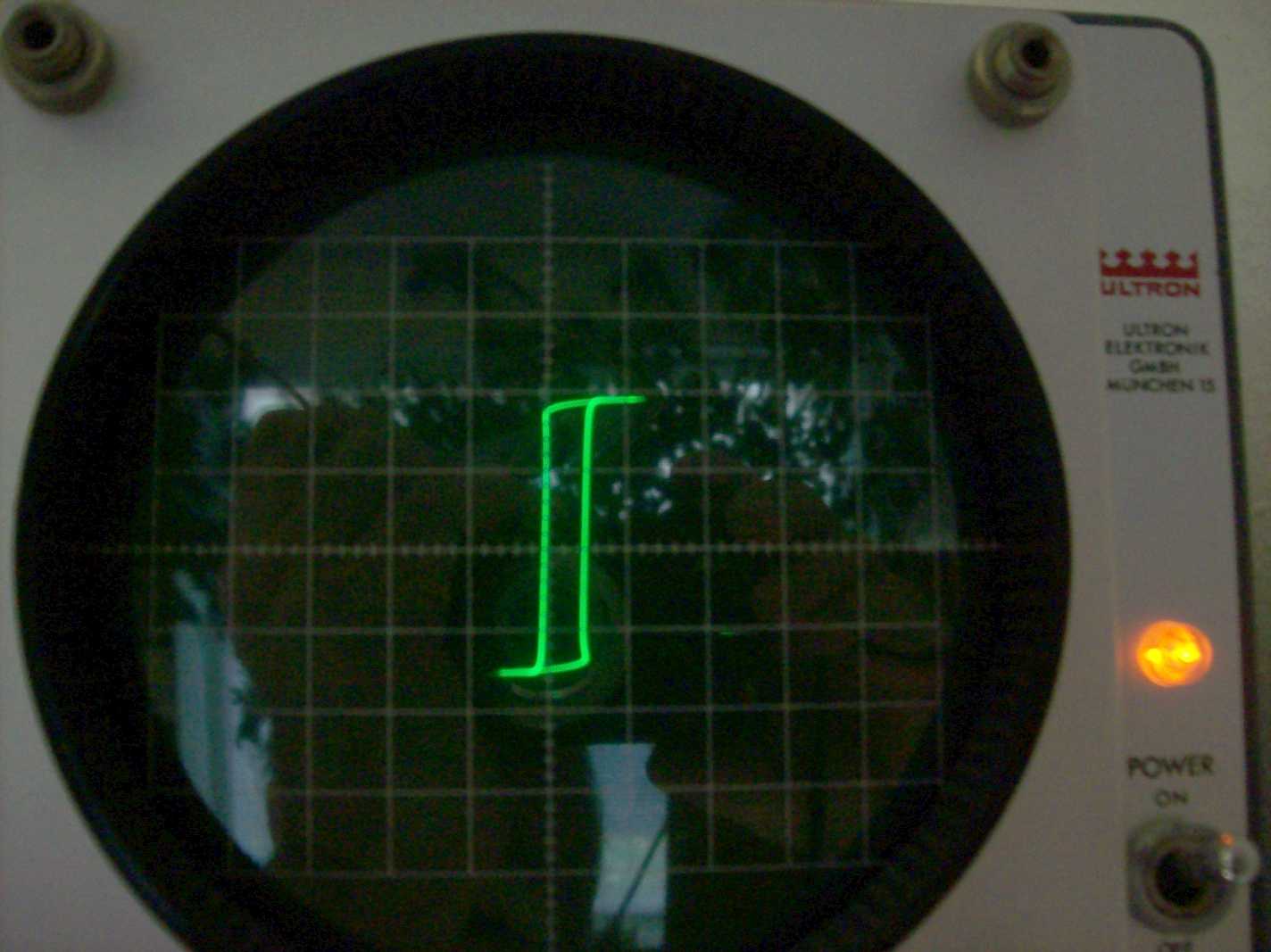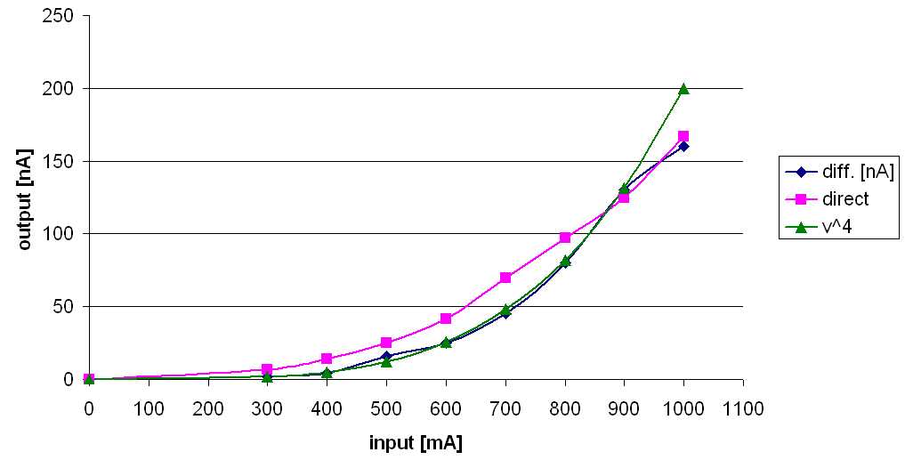 Auf der X-Achse siehst Du den Eingangsstrom (1 kHz sinus) zwischen 0 und 1000mA. Und auf der Y-Achse den Ausgangstrom des Reaktors zwischen 0 und 160nA.