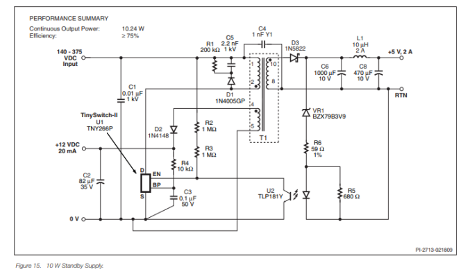 Das Hühnerfutter um den Tinyswitch herum kann m.E. auch kein Snubber sein. Ich sehe da eher einen Transistor, der wegen der fehlenden Potentialtrennung auch passt. Normalerweise wird da ein Optokoppler an den Tinyswitch gesetzt, der die Ausgangsspannung zurückmeldet.