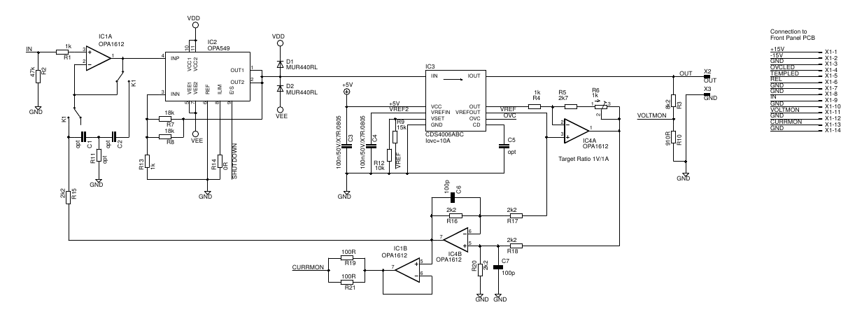 (15.01.2017, 09:09 PM)Black_Chicken schrieb: Gestern habe ich an dem OPA549-Design gearbeitet. Unter Anderem habe ich nach einer möglichst einfachen Möglichkeit gesucht den Ausgangsstrom zu erfassen. Das Signal könnte man dann über BNC nach Außen zur Verfügung stellen und am Scope aufzeichnen usw.