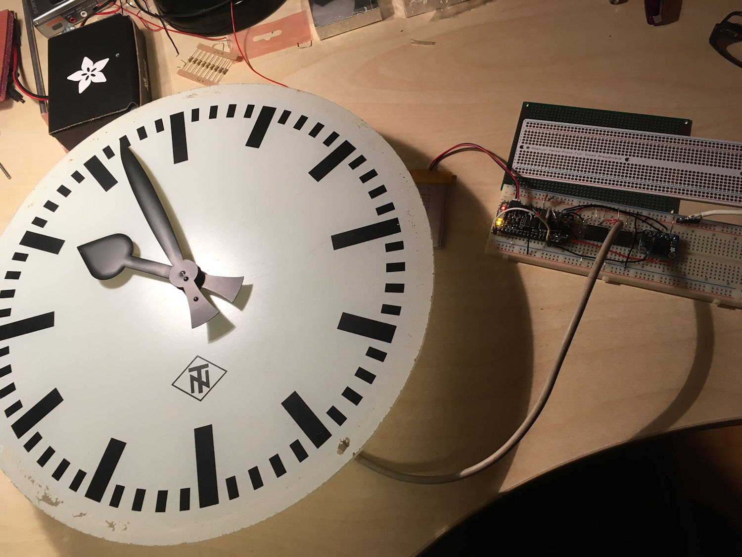 .Also nutze ich die Gelegenheit, eine olle Tochteruhr von TN aus dem Bastelkeller zu holen... Tochteruhren laufen ohne ihre Mutter leider nicht, da sie nur ein sehr primitives (und langlebiges) Schrittmotorwerk haben. Alle Minute braucht es einen 12V-Puls von etwa 0,4s Länge. Die Spule des Werkes muss bei jedem Impuls umgepolt werden, sonst läuft da nix.