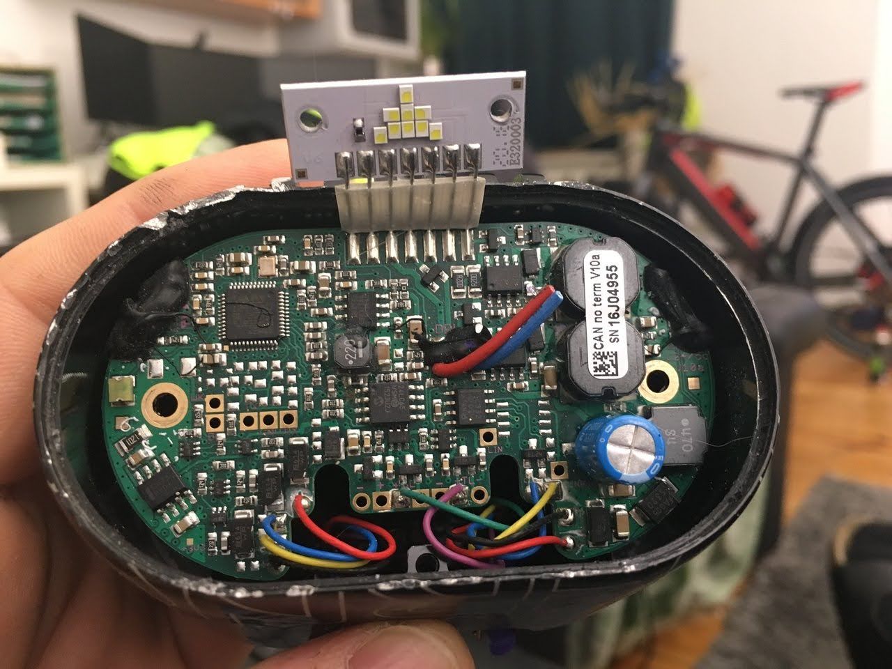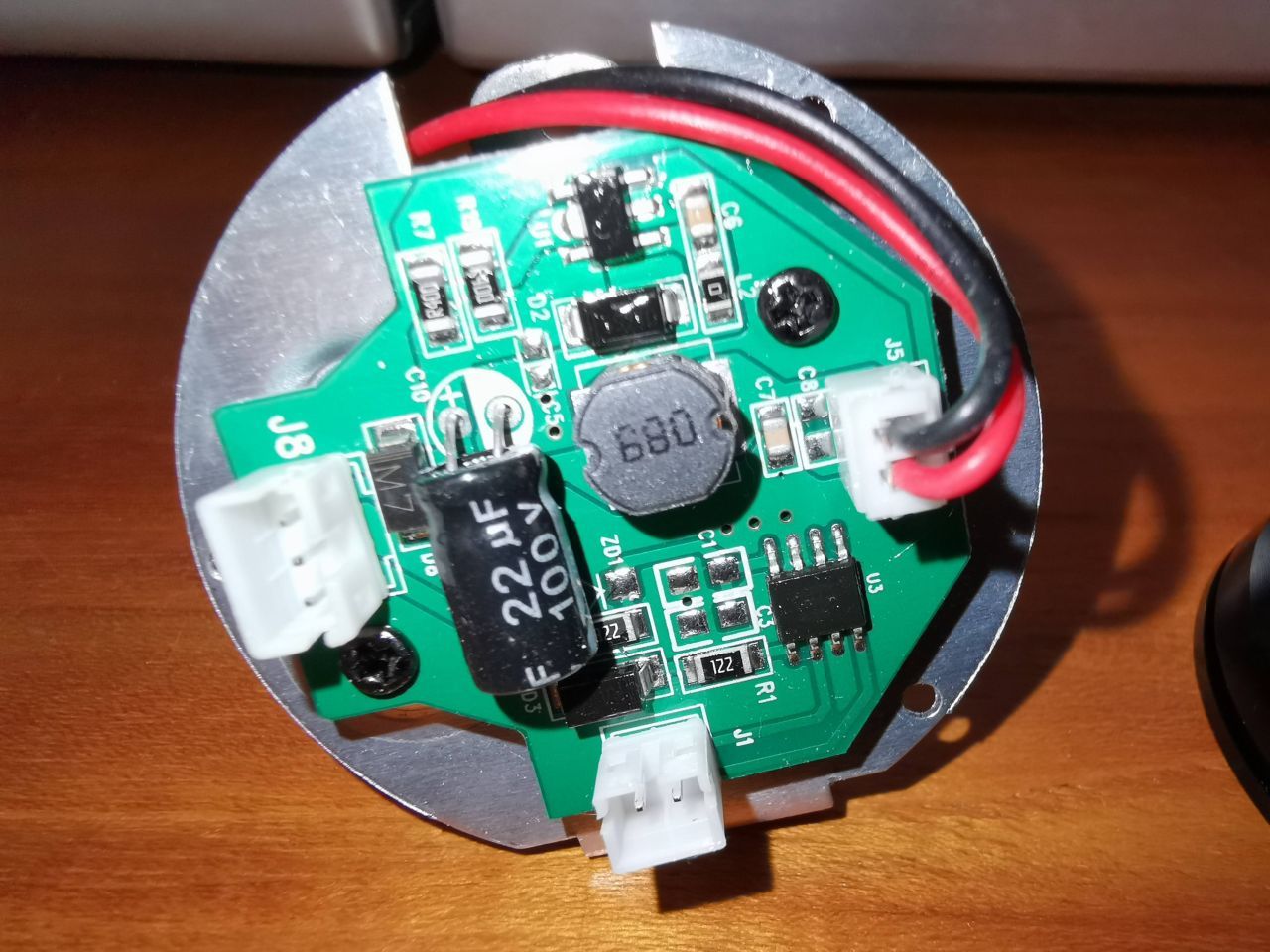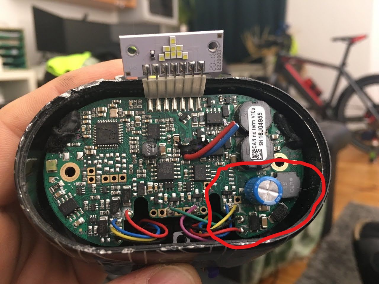 Ansonsten war es danach immer so, dass sich die Lampe am Display abschalten ließ und dann eben nicht mehr einschalten. Nach dem Bild im Anhang, befindet sich nur dieser eine Kondensator am Eingang. Öffnen kann ich die Lampe nicht, da sie nur über das Frontglas zu öffnen ist und das Gehäuse mit Schutzgas befüllt ist. (Man sieht im Bild die Öffnungsspuren)