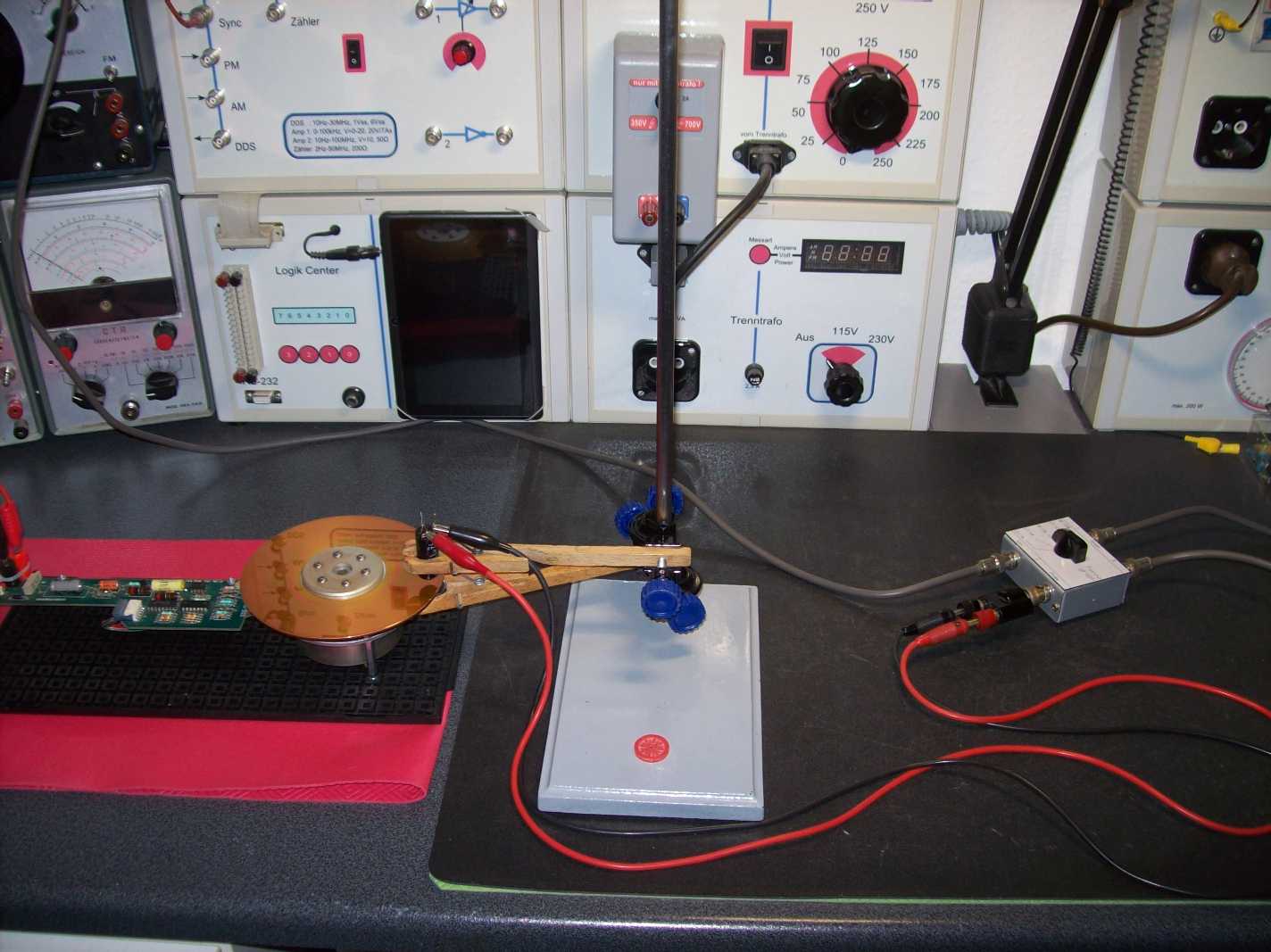 Links der Motor mit Aluscheibe. Unterhalb der Scheibe ein Permanentmagnet (so ist er am wikrungsvollsten). Darüber die Spule, deren Sättigung per Ferrograph dargestellt wird.