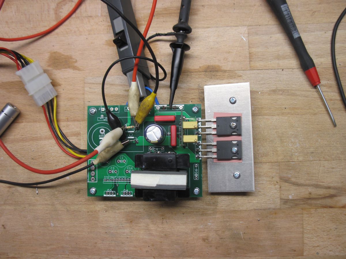 Die letzte Aufnahme zeigt den Test mit 4,77V= Betriebsspannung, 2,958A= Stromaufnahme, 6,44Aeff Primärstrom und einer Resonanzspannung von 374Vpp