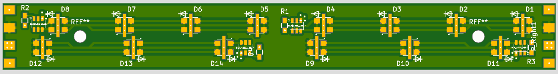 Und anbei noch ein Rendering der Platine (125x15mm), allerdings ohne Komponenten. Nachdem sie rel. schnell fertig werden musste, habe ich auf die Positionierung vom Bestückungsdruck leider nicht geachtet.