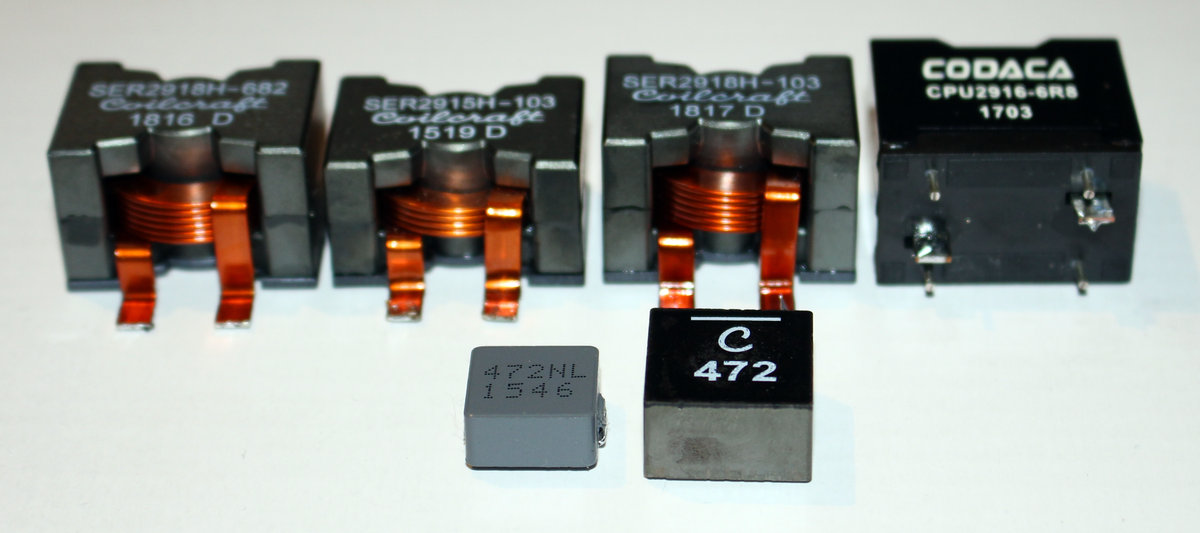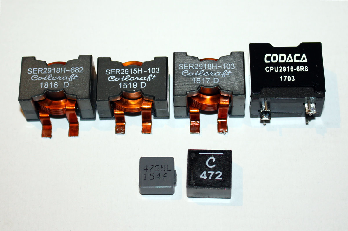 Die großen Ferrite bleiben allesamt kalt, auch wenn die SER2918H-103 offensichtlich schlechter performt als ihre Kollegen. Gestern kamen noch Muster von Pulse (PA4343.472NT), die kleinen Grauen. Obwohl von allen die kleinste Bauform, lassen sie sich bei 230kHz mit Pulse-Skip gut nutzen. Im Vergleich zu den Composite-Drosseln von Coilcraft (XAL1580/XAL1510) werden diese wesentlich weniger warm. Bei derzeit 25°C Raumtemperatur erreichen die Pulse 41°C also dT=16°C - Okay..