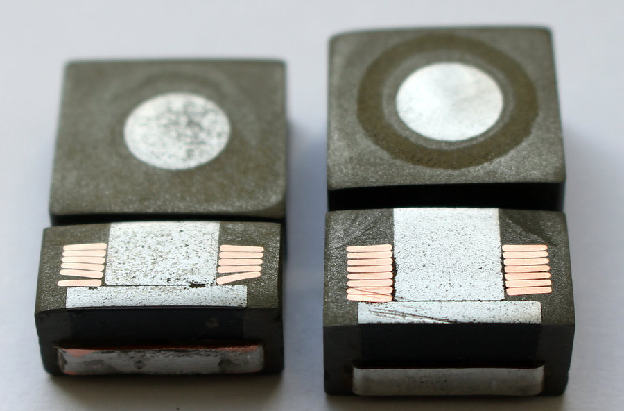 Die Flachdrähte werden unten herum um die Eisenpulverplatte gebogen. Somit existiert ein unterer Sockel auf den der mittlere Eisenpulverkern aufgesetzt wird - mit Luftspalt versehen. Danach wird m.E. der Wickel aufgesetzt und unten gebogen. Bei der -472 sieht es so aus, als ob der Wickel dann mit einer Masse am Kern fixiert wird. Nachfolgend wird die Ummantelung aufgespresst und der obere Spalt mit einem weiteren Material verschlossen.