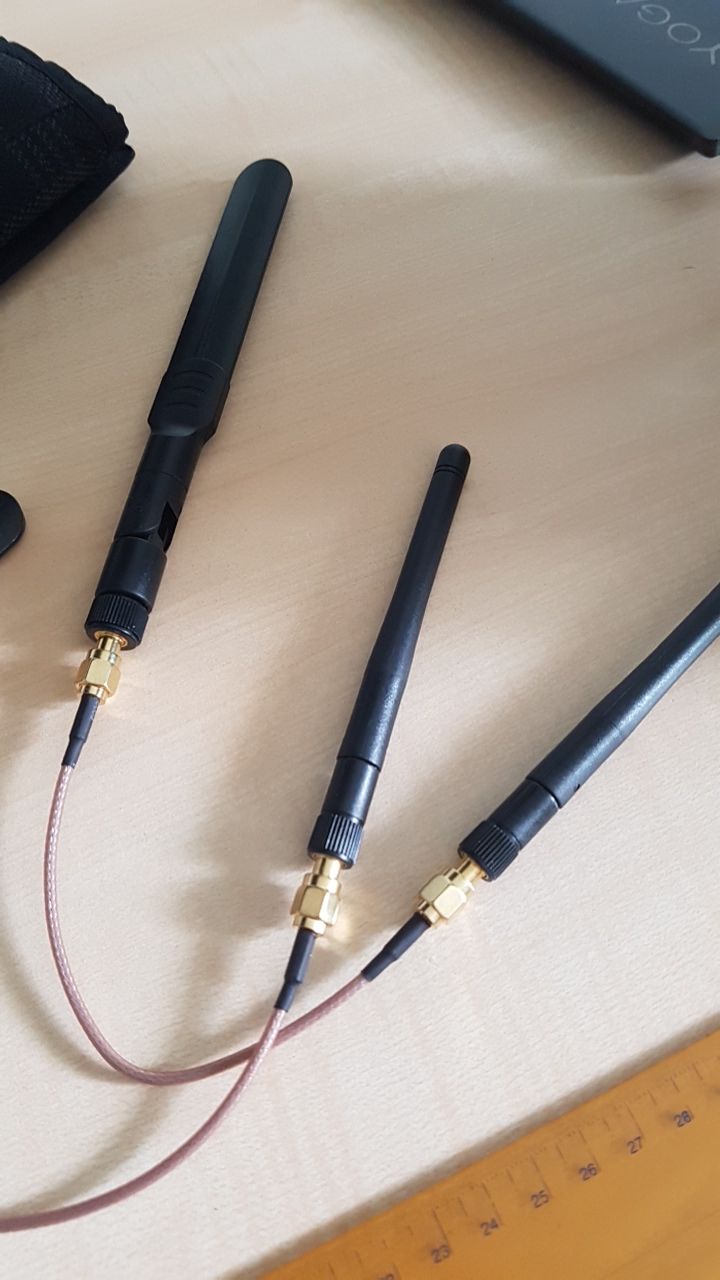 hab ein SMA Kabel aufgeschnitten, angelötet und dann verschiedene Antennen getestet (3dBi klein und 6dBi groß), wie auf den Bildern