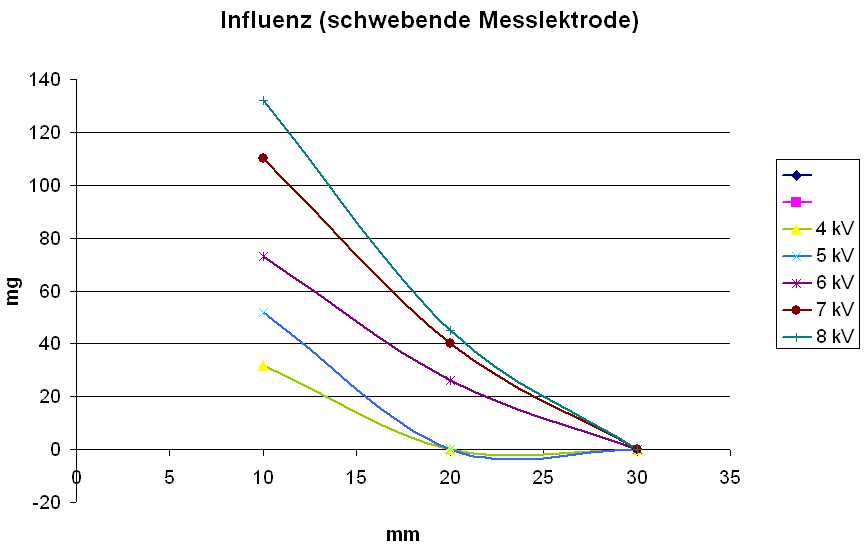 Bei "8kV, 10mm" Feldspannungsdifferenz ergibt sich eine Gewichtsanzeige von 180 mg. Guck ich bei Coulomb bei "4kV, 10mm" (das meint ja 8kV Differenz), so finde ich auch dort 180 mg.
