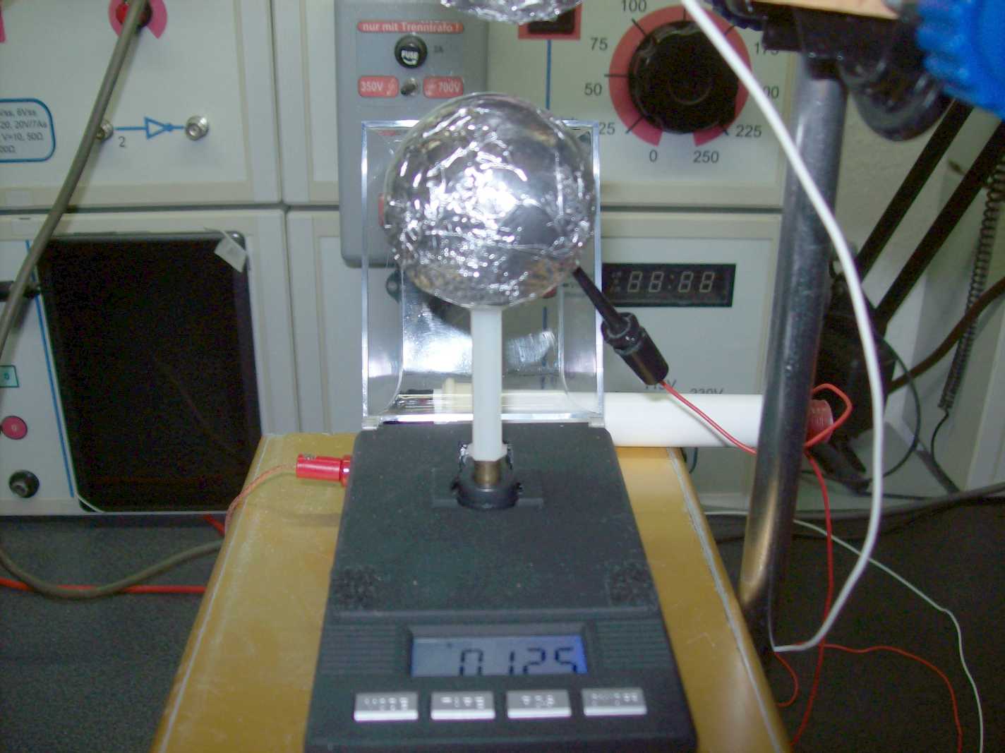 Man kann also auch im Auto oder Flugzeug elektrostatische Entladungen abbekommen. Man sieht die Anziehung der Messelektrode durch den geerdeten Eimer - minimal.