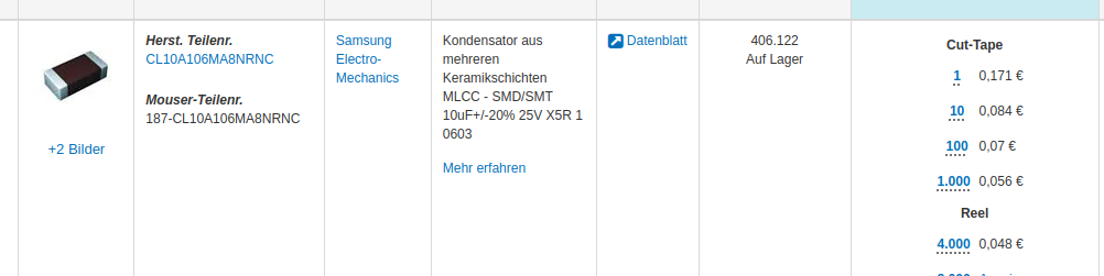 (20.01.2025, 12:56 PM)kahlo schrieb: Kondensatoren mit Kapazitäten jenseits der 1µF sind in dieser Baugrösse selten. Ich vermute, dass es einen Grund dafür gibt. Ich vermute ebenfalls, dass die Haltbarkeit und Empfindlichkeit gegenüber äusseren Einflüssen mit der Kapazität zunimmt. Irgendwo muss die Kapazität ja herkommen. Deshalb tue ich mich schwer damit, diese "dicken Dinger" einzubauen.