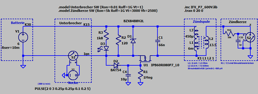Der Kondensator ist notwendig. So, wie er in der Schaltung ist, kann es aber nicht bleiben. Laut Simu induziert er im Mosfet Leistungsspitzen im zweistelligen KW-Bereich. Er muss zurück zwischen die beiden Zündspulenanschlüsse oder gegen Masse.