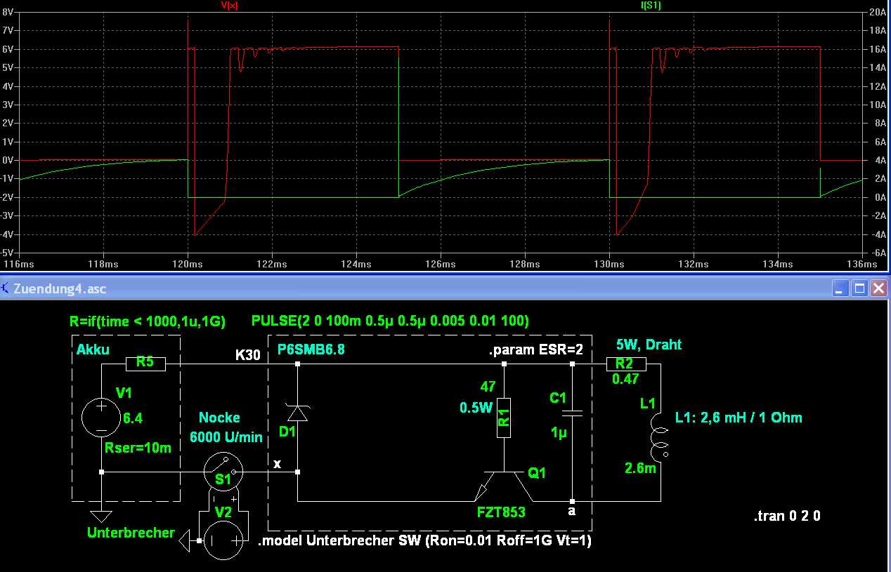 Ich hab nun endlich auch gerafft, warum C1 nicht parallel zum Halbleiter sein darf. Nach dem Abschalten von S1 pendelt Strom über L1, C1 und D1. So lange der Strom C1 auftankt, gibts kein Problem. Schlimm wirds aber, wenn C1 den Spulenstrom umdreht. Dann entsteht an der Suppressor-Anode eine negative Spannung, die den Halbleiter (egal ob MOS oder BJT) leitend macht (siehe rote Spannung, in grün der Schalterstrom). Und dann wird C1 über den Halbleiter entladen. Bumms.