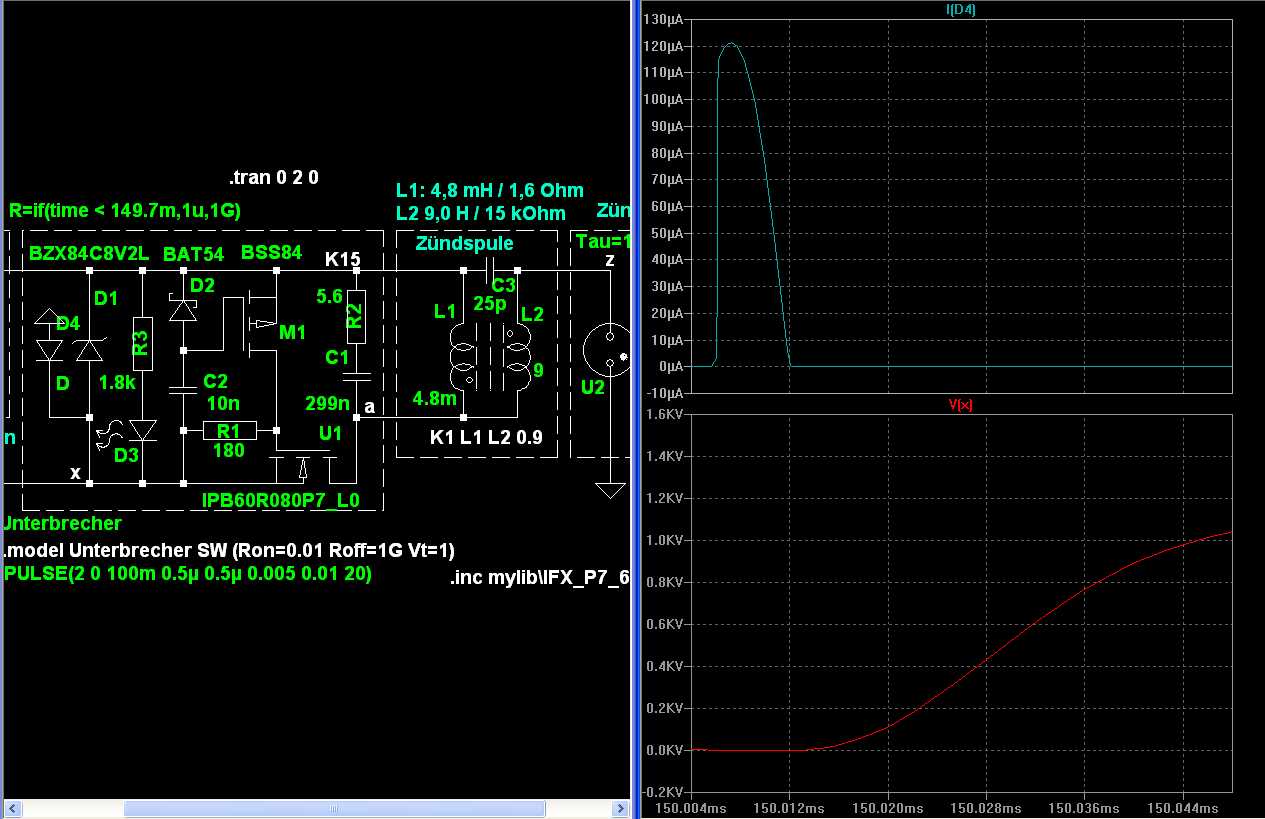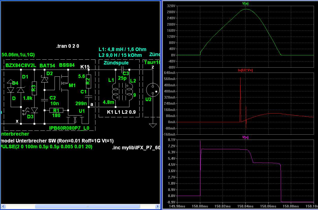 Oberer Plot: Nach der Öffnung des Unterbrechers bei 150ms steigt die Spannung an Punkt "a" an