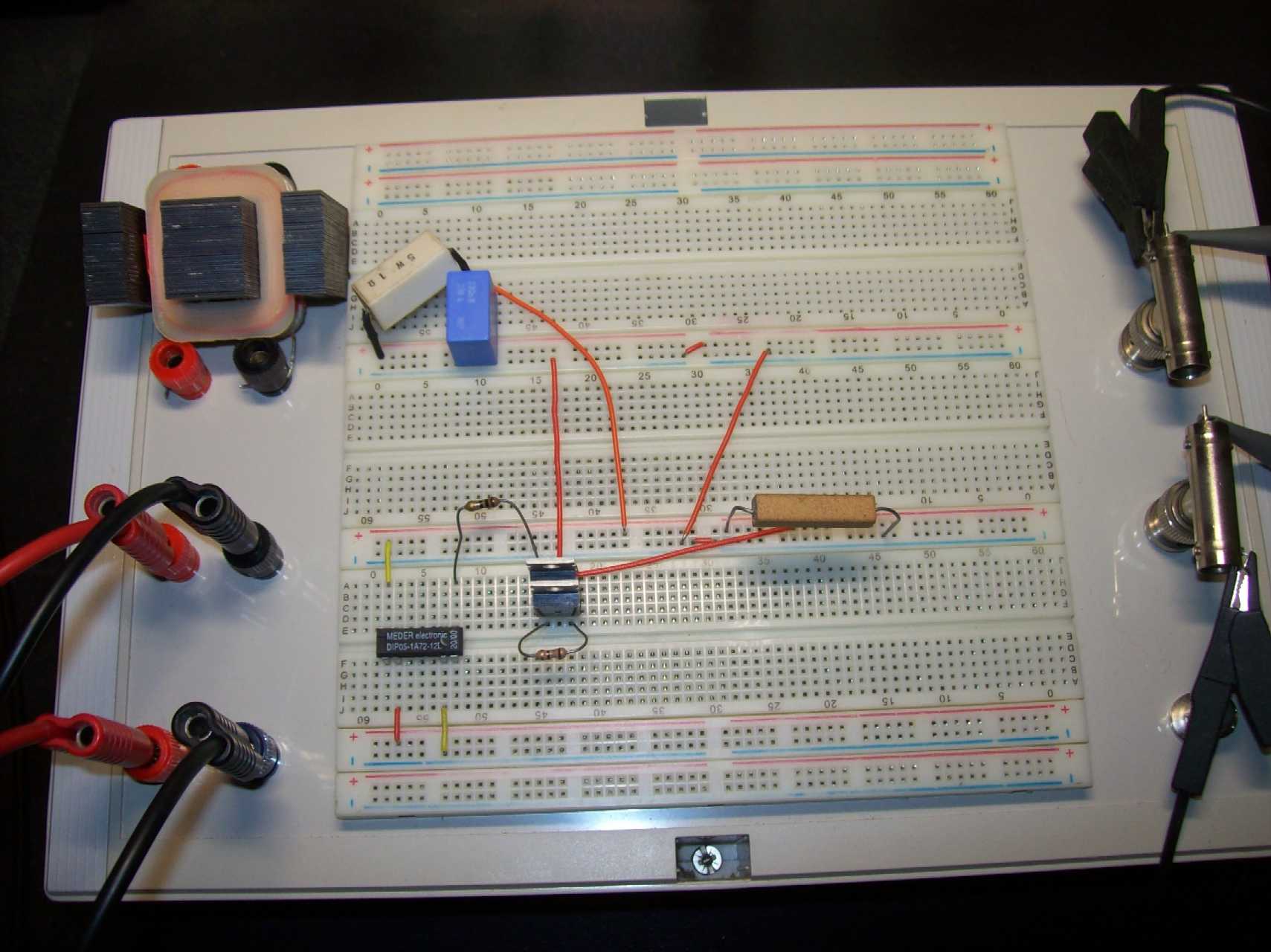 Zwei IRF740 parallel. Ub=6V. L=2.4mH mit 0.8 Ohm - daher noch diskrete 1 Ohm in Reihe. Reed-Relais wegen 6000 U/min. 180 Ohm zwischen Gates und Sources. 10 Ohm zwischen Reed und Gates. 330nF mit ESR=4 Ohm. Keine Zündkerze dran.