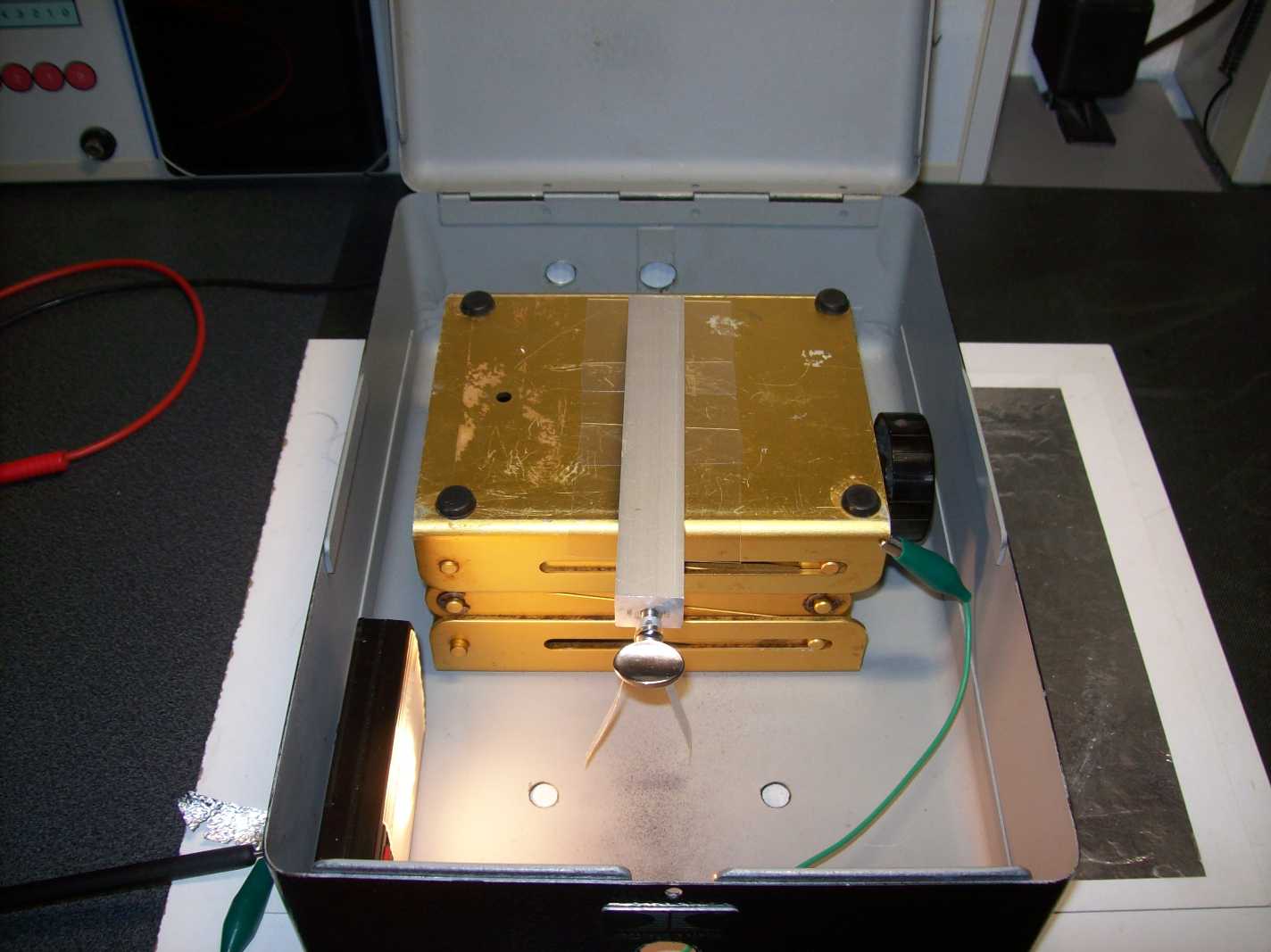 Elektroskophalter mit Plastikfolie vom Laborboy isoliert und positiv aufgeladen.