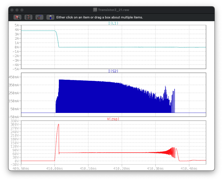 Hier wird der Strom primär nach dem ersten Spannungspeak auf 0 gebracht und sämtliche Energie im Kern gleichmässig auf die Sekundärseite gebracht. Dabei hält sich die Primärspannung bei etwas über 60V, bis der Kern entsättigt ist.