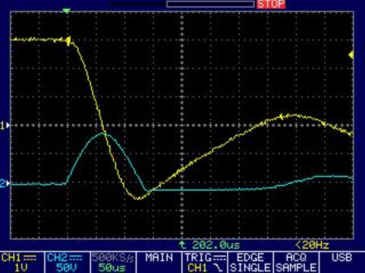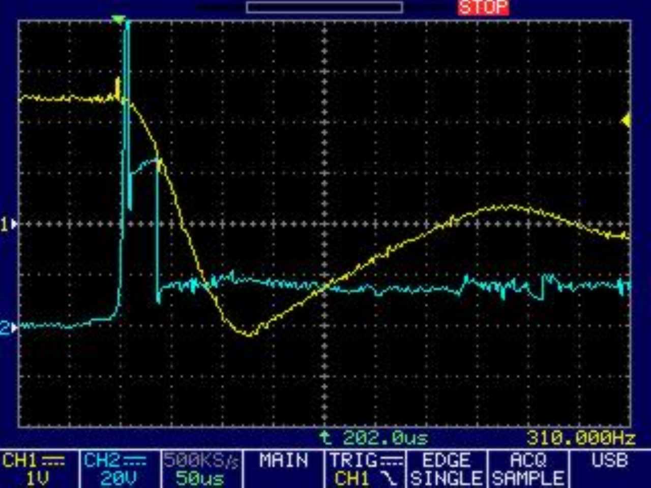 Und nun kommt ein Leckerbissen. In gelb der Spulenstrom und in blau die SEKUNDÄRE Spannung (jaja... ich trau mich was):