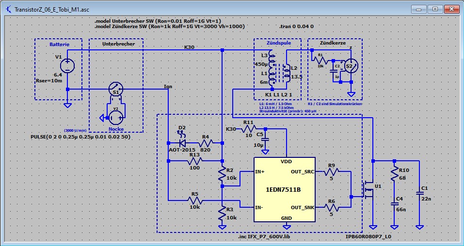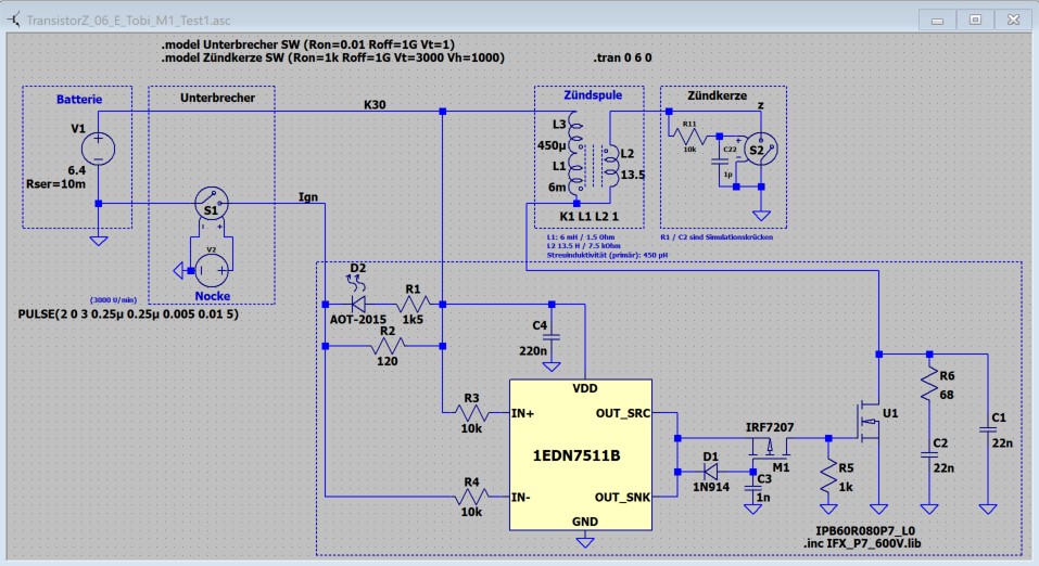 Ich würde als Schalter einen 650V-Transistor einsetzen, für eine gute Reserve bei maximaler Bordnetzspannung, kaputtem Zündkerzenstecker, etc..., aber trotzdem nicht auf den parallelkondensator verzichten. Den würde ich als NP0-MLCC oder belastbare Folie ausführen. Parallel würde ich einen Snubber einsetzen, um Die Oszillation nach dem "Leerlaufen" der Zündspule wegdämpfen zu können, oder ggf. auch, mit Hilfe der Streuinduktivität, die Spannungssprünge beim zünden.