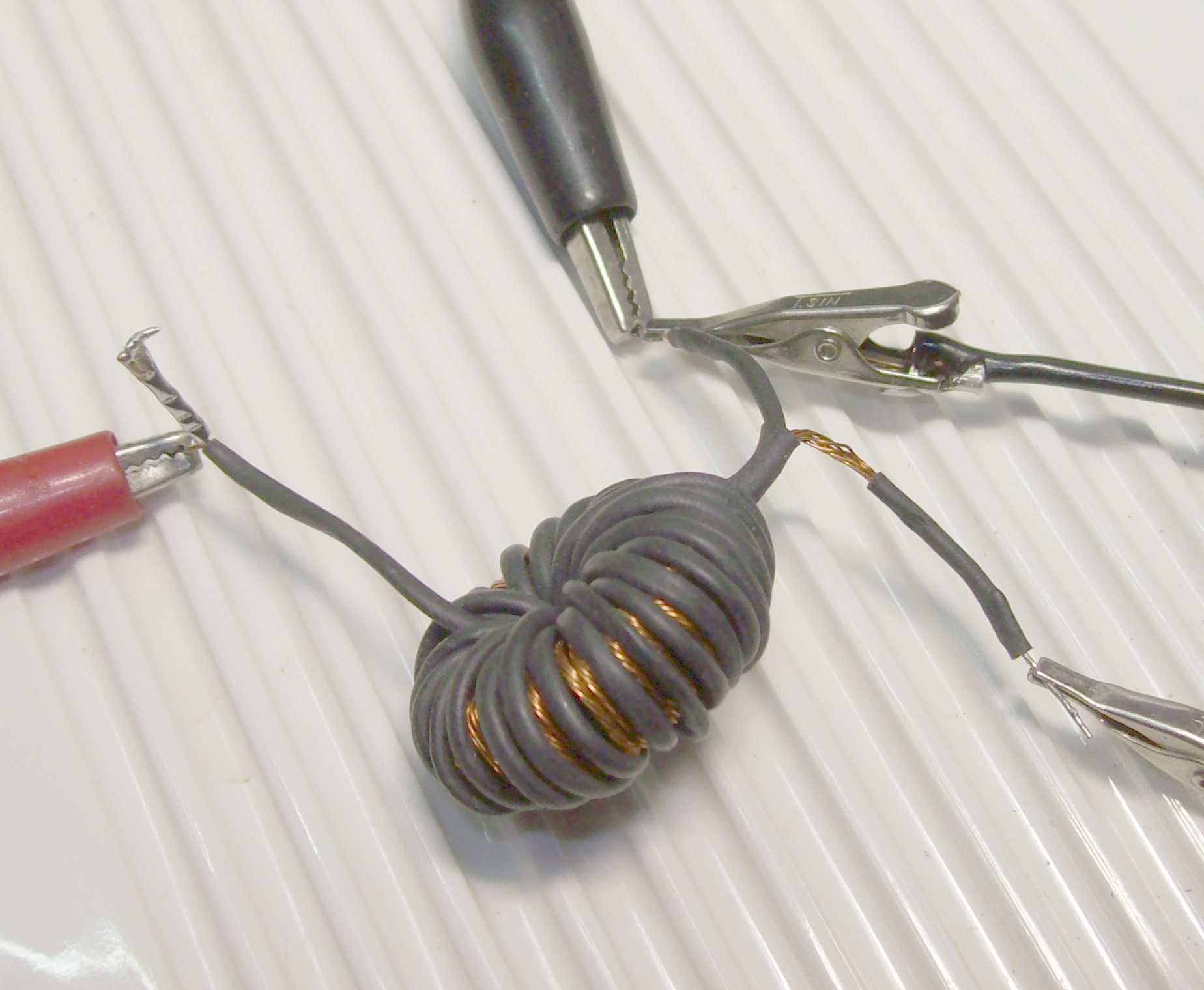 In der wild aufgewickelten Spule sind Kupfer und Konstantan antiparallel. Gespeist wird der Kombidraht mit DC ~1A. Alte Billig-Metallsucher sind perfekt. Die haben einen Eintaktoszillator, dessen Frequenz sich durch das schwache asymmetrische Feld verändert. Dadurch ändert sich der Stromverbrauch des Oszillators und das wird zur Anzeige gebracht.