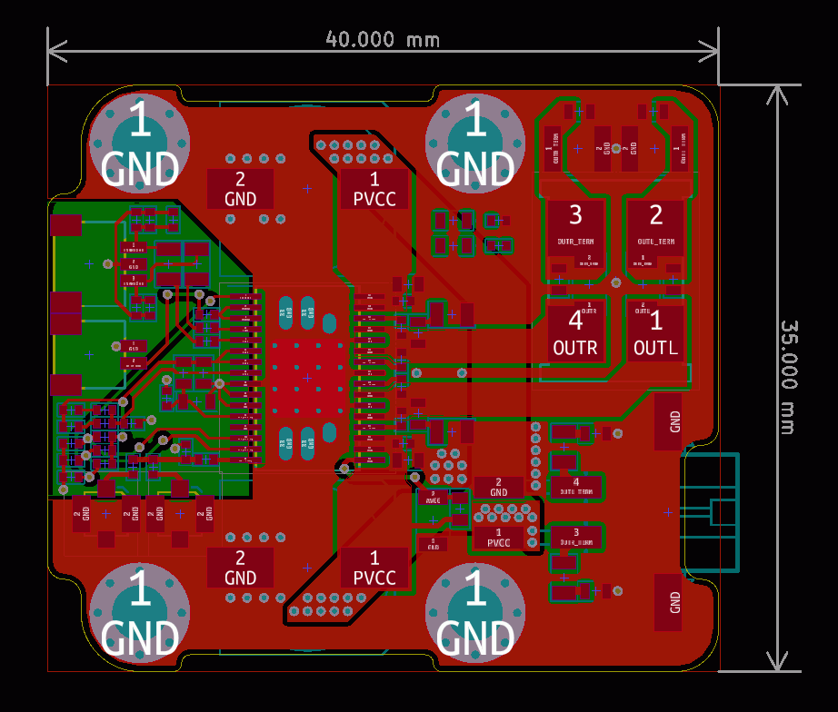 Nochmal die Datenblätter verglichen, TPA3116/18/28 haben alle den selben OC-Trippoint (7.5A). Die Limitierung der Ausgangsleistung ist einzig thermisch begründet. Somit fällt die Wahl auf den TPA3128, dieser hat nur 90mR im Vergleich zu 120mR (TPA3116/3118). Auch scheinen sie den Thermalpfad etwas optimiert zu haben.