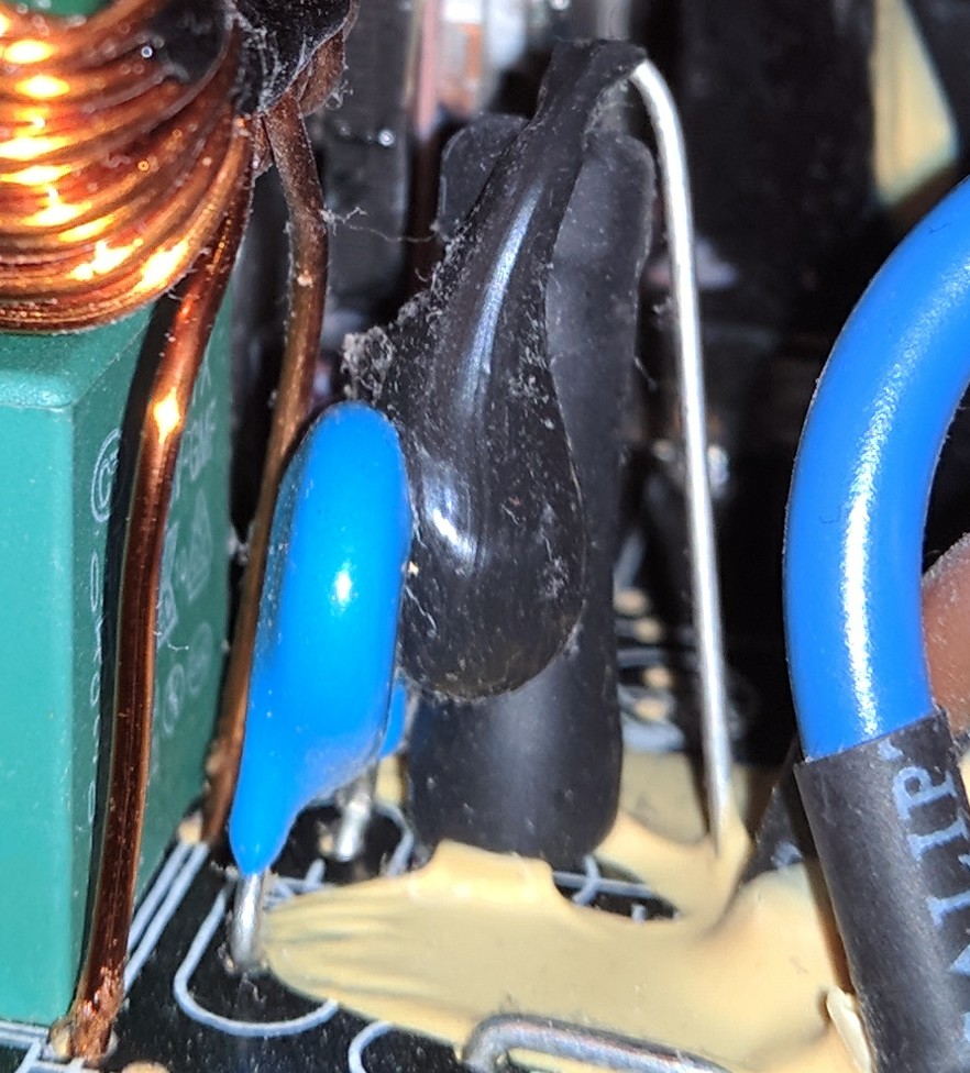 der schwarze Hauptdarsteller dürfte eine eingelötete Sicherung in engem shrinking tube sein. F1 würde ja dazu passen. Aber wenn die durch ist, ist da sicherlich mehr zu erwarten.